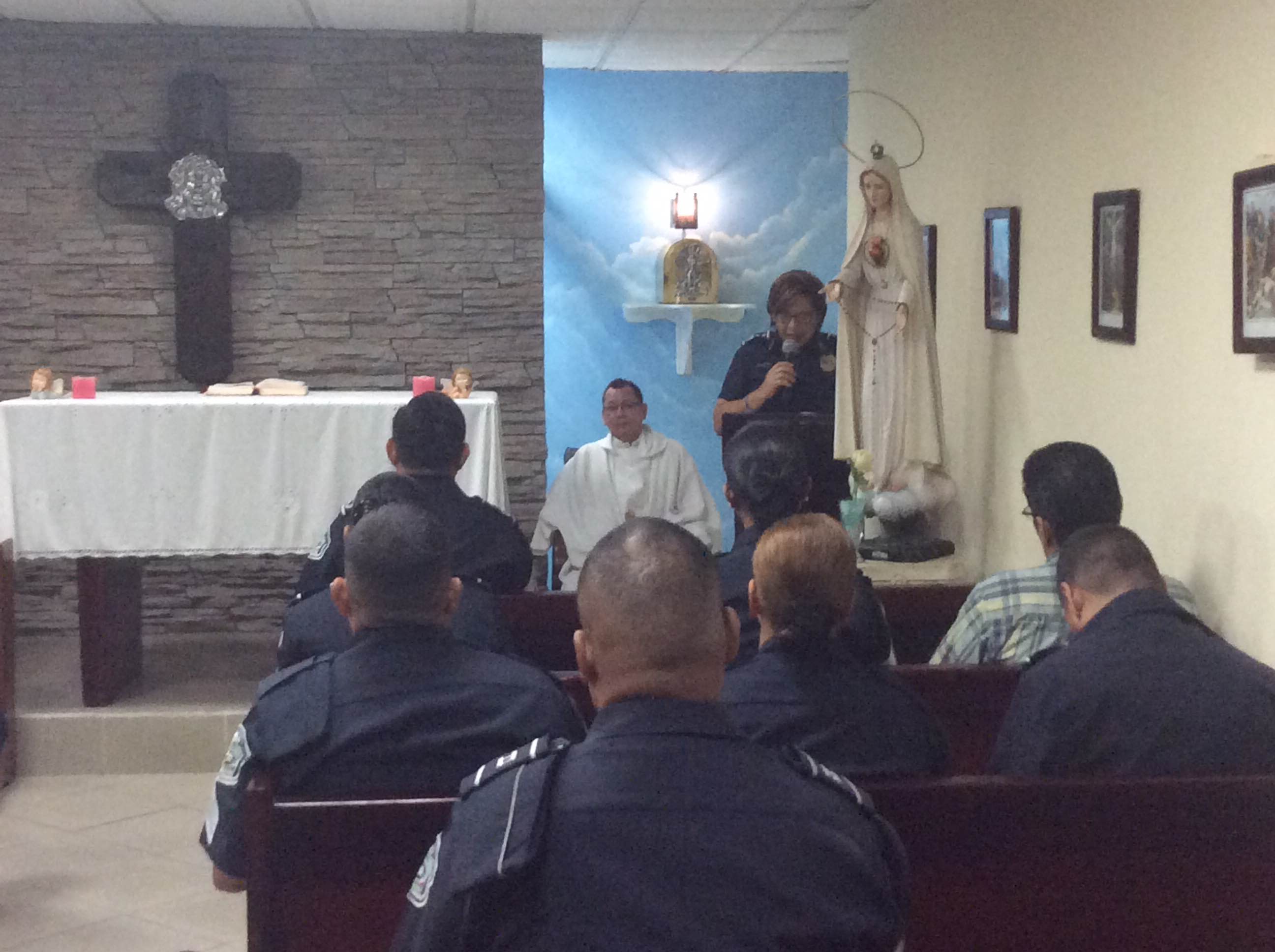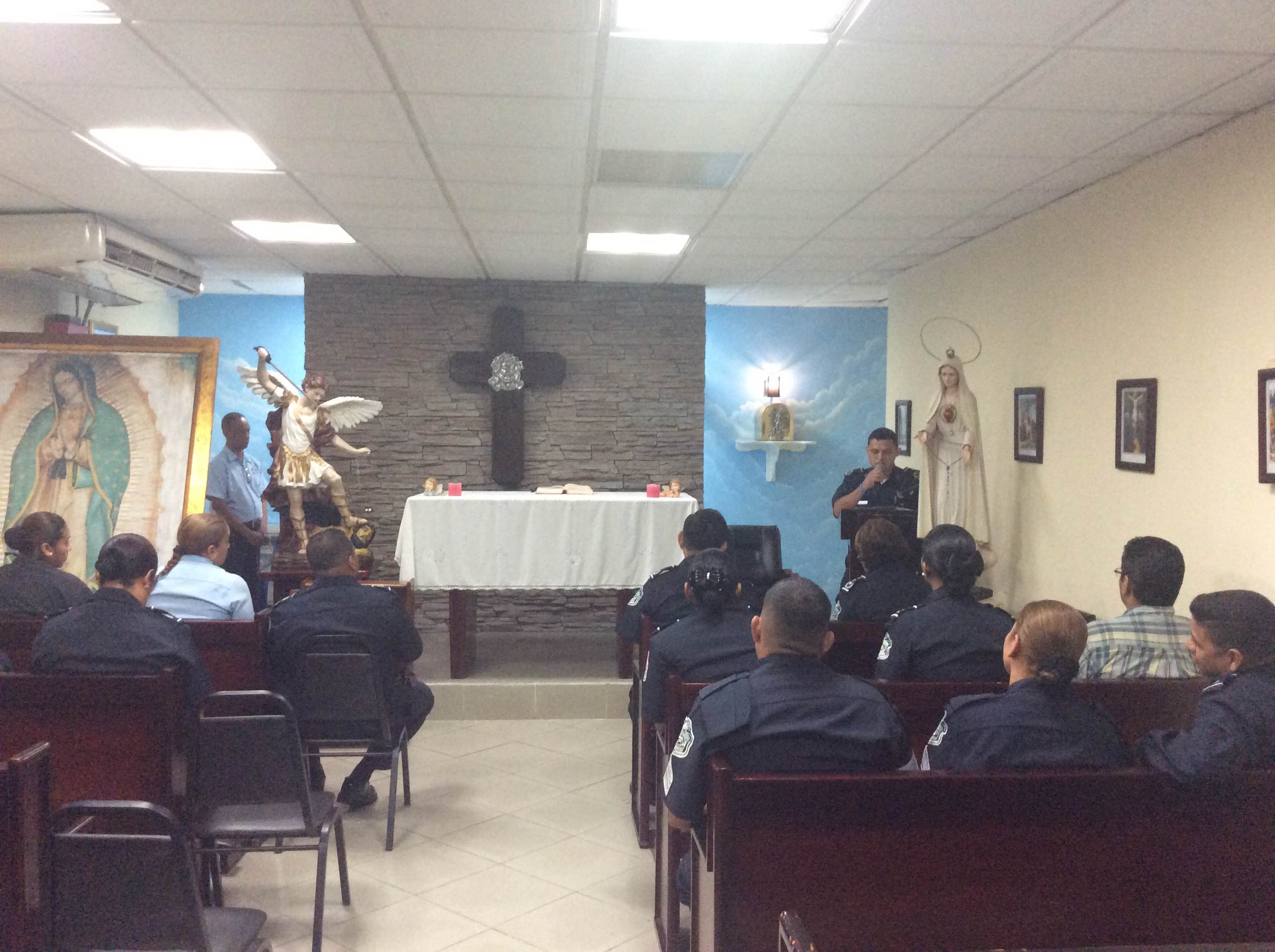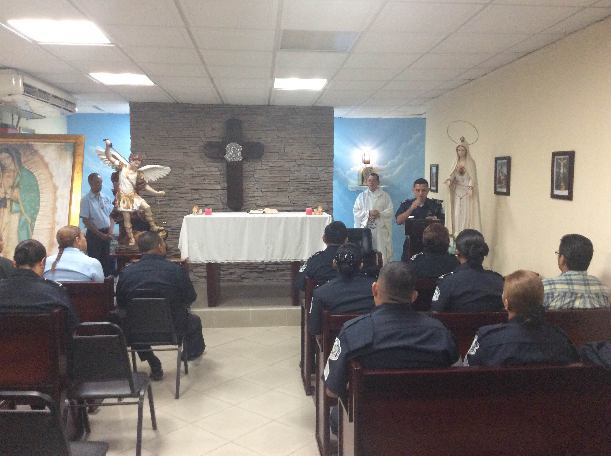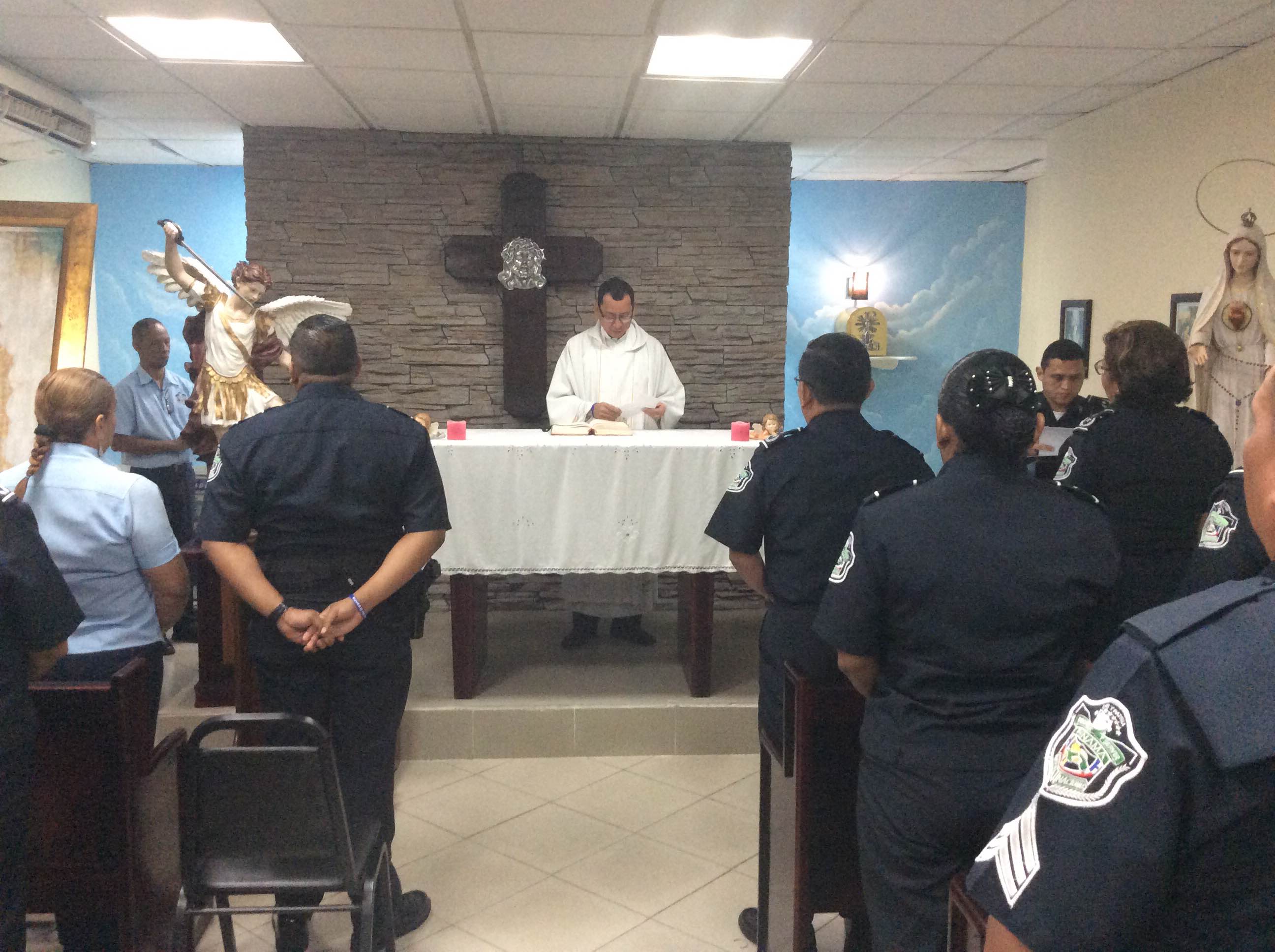 En un acercamiento con Dios las unidades policiales y miembros no juramentados de la Departamento de Inspectoría General y la Dirección de Gestión y Proyectos, agradecieron las bendiciones otorgadas a cada uno de los que integran la Policía Nacional, en una misa que se celebró en la capilla San Miguel Arcángel, en la sede de la Policía Nacional en el corregimiento de Ancón. En la misa presidida por el capellán Edgar Flores, invitó a que seamos ejemplo de Jesús y con mucha emoción elevó una plegaria a todos los sacerdotes por motivo de celebrarse un aniversario más de San María De Viannet su patrón. Quienes integran estas dependencias estuvieron acompañados por miembros de diferentes departamentos, invitados especiales de la Fundación Fe, la Comisionada Oris Jaén, Jefa de Dirección Nacional de Gestión y Proyectos, el comisionado Darío Díaz de Inspectoría General y uniformados. Los presentes elevaron una oración ante el Señor por cada uno de los integrantes de ambas Departamentos, que en cuyas manos está la misión de ser celadores y garantes de la transparencia en la labor de los miembros de la Policía Nacional. Una vez al mes, celebramos este tipo de actividad con el objetivo de dedicar un tiempo de oración y agradecimiento con Dios, la misma fue transmitida directamente por radio María. |