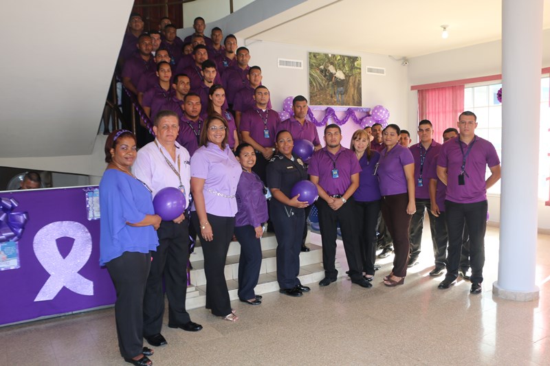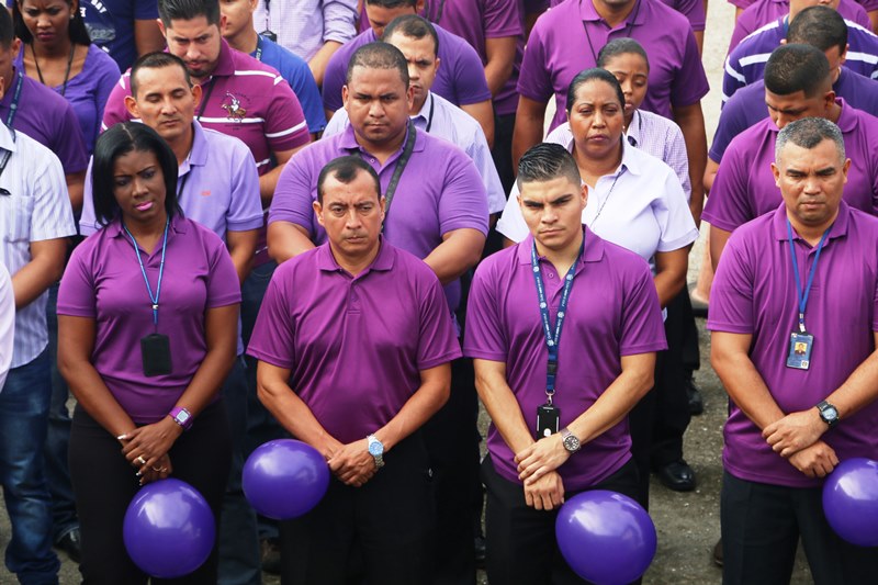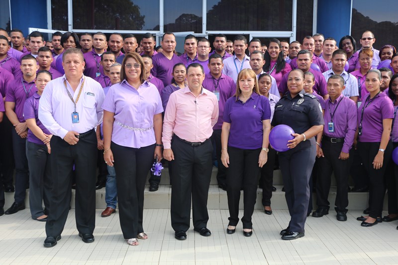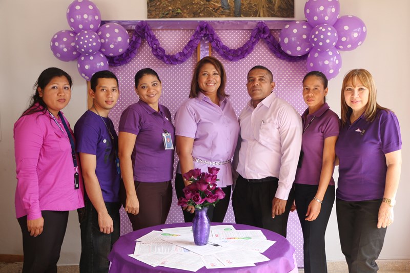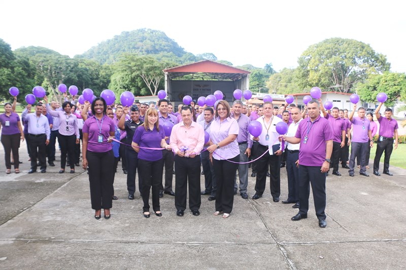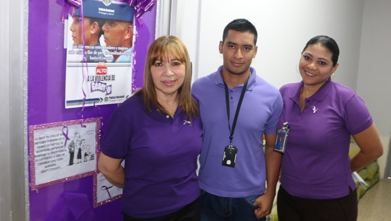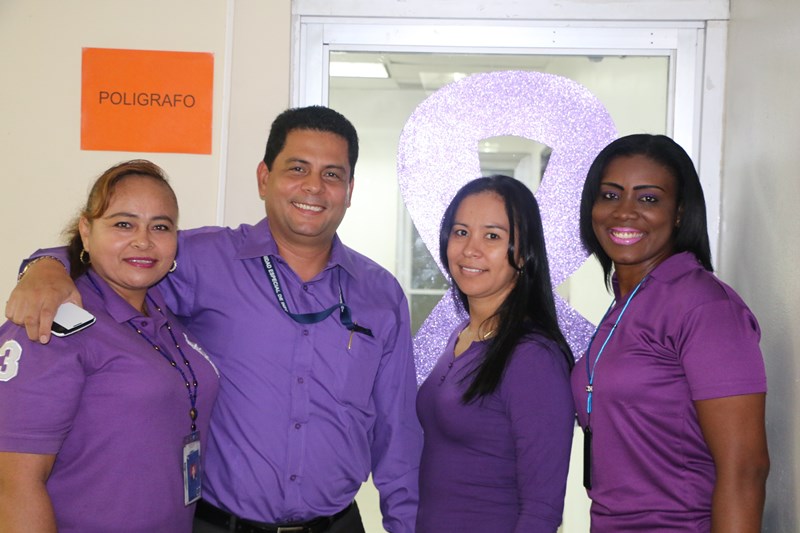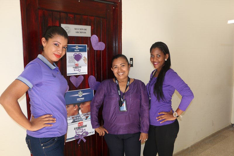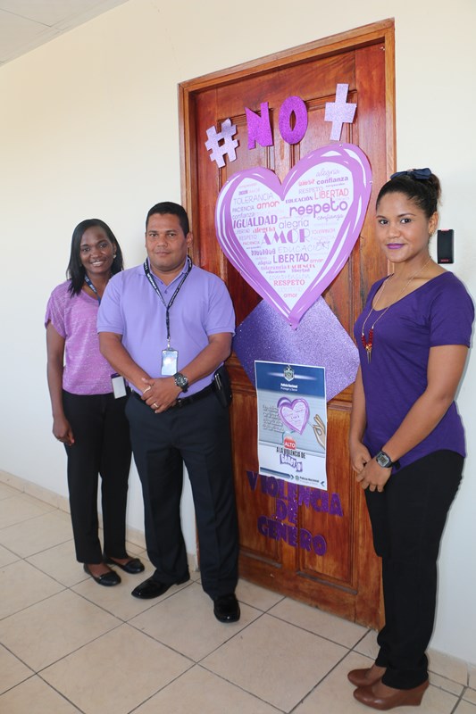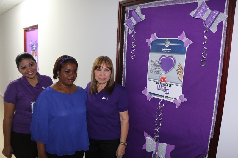 Una mañana de motivación, abre una serie de actividades de formación e información, en apoyo a la campaña en contra de la violencia de género, en las instalaciones de la Dirección Nacional de Inteligencia Policial. El comisionado José Huertas hizo el corte de cinta protocolar, frente a la formación compuesta de policías, que laboran en esta dirección ataviados de color púrpura, en medio de las decoraciones distintivas de esta campaña, y motivados a participar de las actividades directamente ligadas a la erradicación de este flagelo. Las puertas de cada oficina fueron ambientadas a manera de recordatorio de alta importancia en la promulgación de la equidad tanto para mujeres y hombres. |