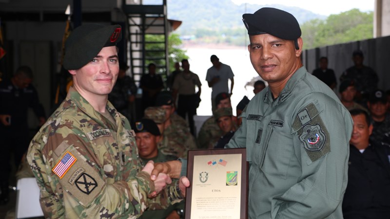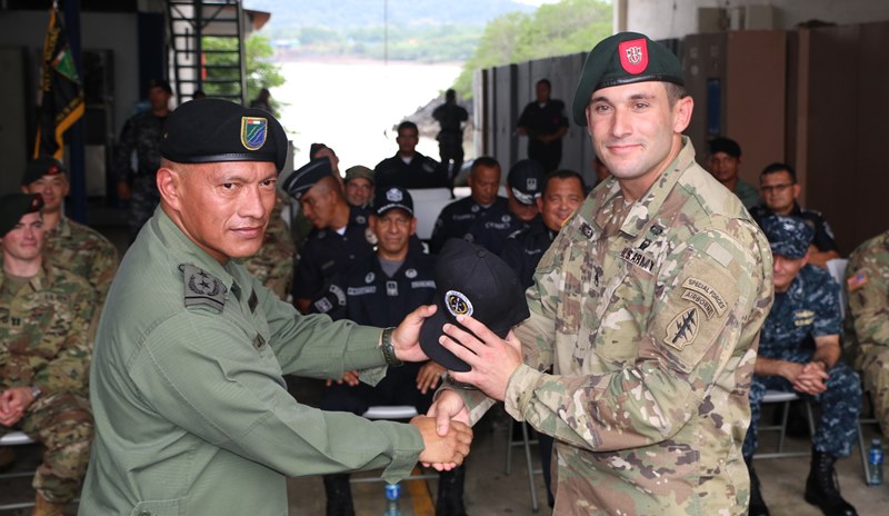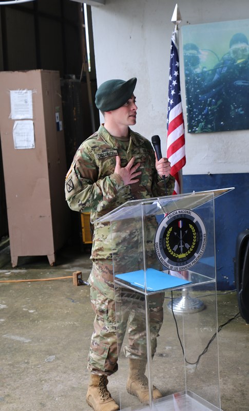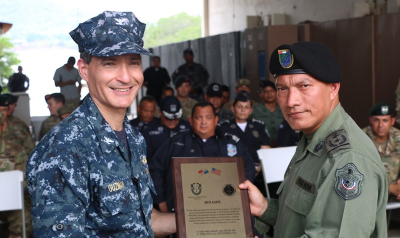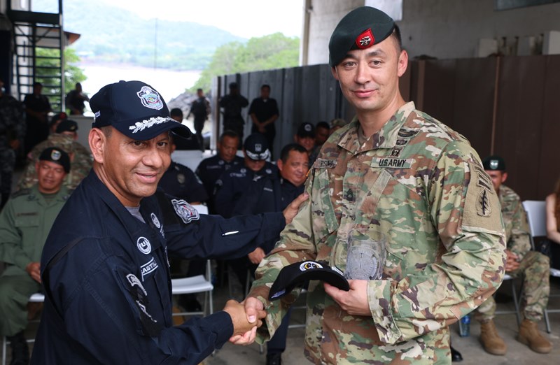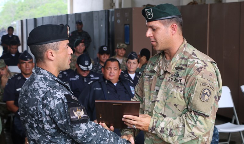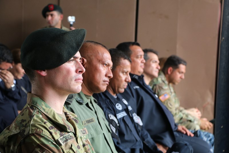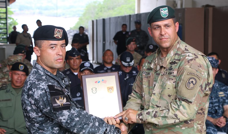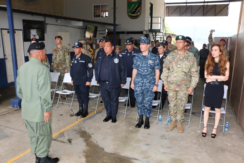 La Policía Nacional a través de la Dirección Nacional de los Servicios Policiales Especiales (Dinaspe), realizó la ceremonia protocolar de reconocimiento a facilitadores del Gobierno de los Estados Unidos. Se trata de la capacitación de 50 unidades de las Fuerzas Especiales Contra el Terrorismo (UFEC) y la Unidad Táctica De Operaciones Antidrogas (UTOA) que fueron entrenados por unidades de Fuerzas Especiales Operacionales Alfa, del grupo 7 del Ejercito de los Estados Unidos. En el acto de reconocimiento participaron, el Director General de la Policía Nacional, Omar Ariel Pinzón Marín; el Subdirector General, Javier Castillo el Director Nacional de los Servicios Especiales Policiales, Javier Rodríguez, además de representantes de la Embajada de los Estados Unidos e invitados especiales. Pinzón Marín hizo entrega de reconocimientos y obsequios a los instructores. También aprovechó la oportunidad para agradecerles su cooperación en estos entrenamientos brindados a unidades especializadas de la Policía Nacional. El Director General de la Policía Nacional dijo que la preparación que han recibido los uniformados es indispensable para la lucha contra el crimen organizado y otras amenazas. Esta capacitación inició el 12 de julio y culminó el 15 de agosto, tiempo en que ambos grupos especializados se actualizaron en diversos temas, sumando así mayor conocimiento. |