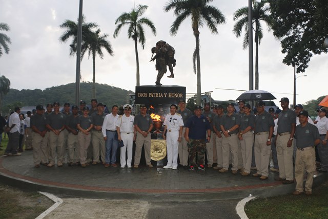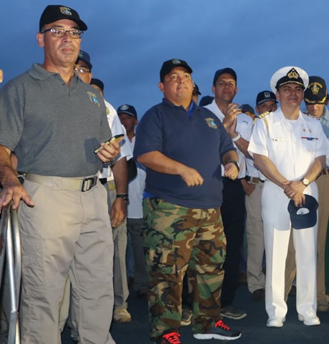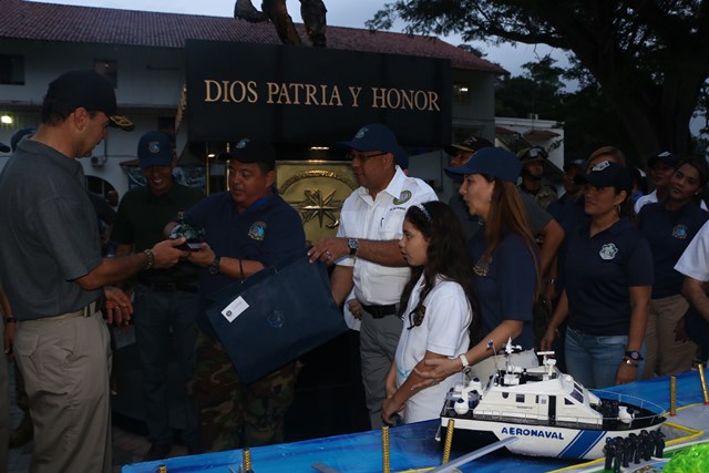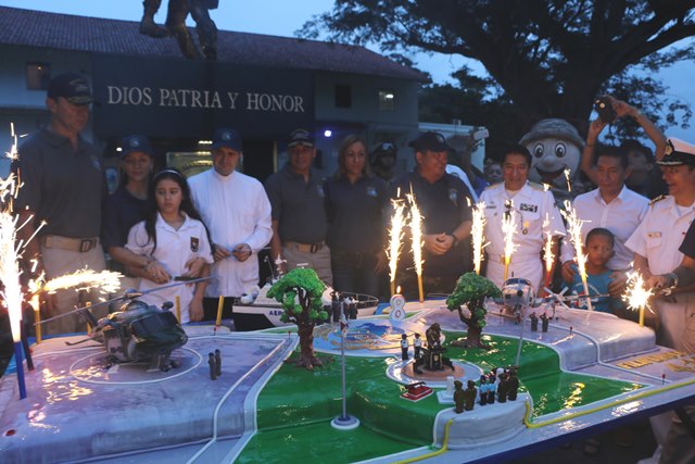 El Director de la Policía Nacional Omar Ariel Pinzón Marín, junto a miembros del Directorio de esta institución participaron activamente en la celebración del Octavo Aniversario de fundación del Servicio Nacional Aeronaval (SENAN), creada tras el Decreto de Ley 7 del 20 de agosto de 2008 y está adscrita al Ministerio de Seguridad Pública. El acto contó además con la presencia de agregados policiales, militares y aeronavales de países amigos quienes honraron con su presencia esta actividad. Igualmente estuvieron presentes altos mandos del Servicio de Protección Institucional, el Servicio Nacional de Fronteras, la Policía Nacional y el Servicio Nacional Aeronaval. Pinzón recordó que la Policía Nacional y el Servicio Nacional Aeronaval junto a otros estamentos de seguridad, son hermanos en una lucha mancomunada contra el crimen organizado y el tráfico de drogas, esfuerzo este que ha logrado bajar los índices de delincuencia. “El país entero se enorgullece de la eficiente y arriesgada labor de estos hombres y mujeres de uniforme que a diario abandonan sus hogares y familias para brindarnos seguridad a través de sus patrullajes en las extensas e interminables costas panameñas, en una muy difícil tarea de custodiar nuestro mar territorial. A ellos van mis saludos y mis respetos”, puntualizó el Director de la Policía Nacional Omar Pinzón. Las celebraciones incluyeron dianas, interpretaciones musicales de las bandas de los diversos estamentos de seguridad, la partición de un enorme dulce ingeniosamente diseñado con embarcaciones navales y helicópteros, herramientas utilizadas en la lucha realizada diariamente por el SENAN, además de la develación de un monumento a los caídos en homenaje a aquellos hombres y mujeres de uniforme que han ofrendado sus vidas al servicio de la nación panameña.