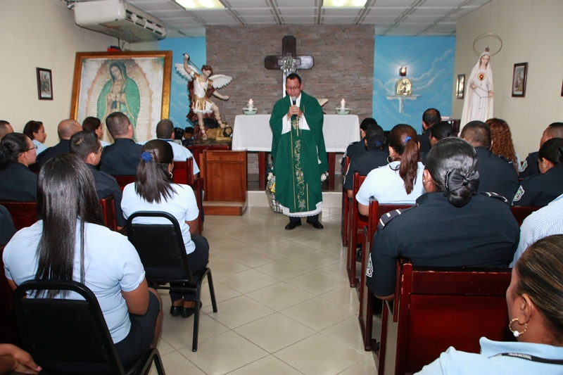El personal juramentado y no juramentado de la Dirección Nacional de Recursos Humanos de la Policía Nacional se unieron en oración durante la Santa Eucaristía que cada jueves se realiza en la capilla San Miguel Arcángel, de la sede ubicada en el corregimiento de Ancón. Durante la homilía, el capellán Edgar Flores exhortó a los presentes a seguir a Cristo en una vida de caridad y amor al prójimo, reafirmando nuestro compromiso cristiano. Luego de leídas las lecturas de las sagradas escrituras, se elevó una oración por la salud de cada miembro de la institución que con vocación de servicio brindan seguridad a la comunidad. |