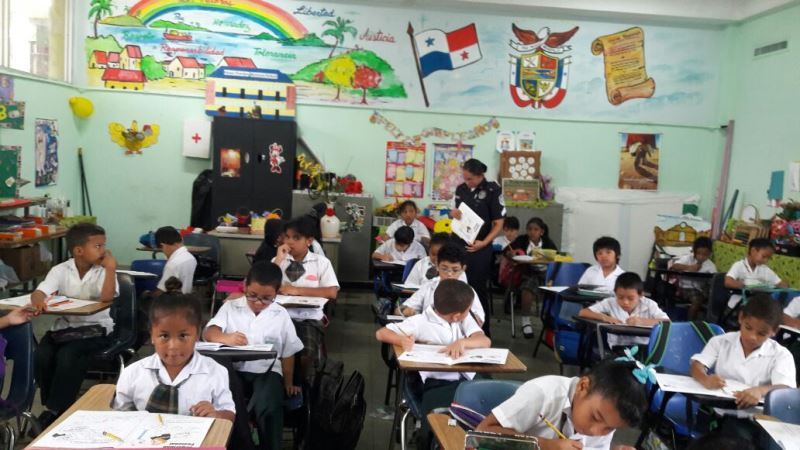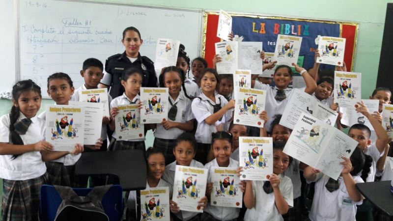La Policía Nacional a través del Servicio de Policía de Niñez y Adolescencia, llevó el programa “Amigos Protectores”, a la escuela Omar Torrijos Herrera en Paraíso, corregimiento de Ancón, beneficiando a 95 niños y niñas que cursan el segundo grado. Los niños recibieron el material didáctico de "Amigos Protectores" que consiste en un libro de colorear repleto de actividades, dirigido a niños de 1° y 2° grado, con el que aprenderán medidas de seguridad, como no ir con extraños, precauciones al cruzar la calle, usar casco protector cuando utilizan sus bicicletas, entre otros consejos. Este libro es apoyo al programa de Prevención de Educación para la Resistencia al Uso y Abuso de las Drogas y la Violencia (D.A.R.E.), dijo su instructora, cabo María Saldaña. "Compartir entre compañeros fue lo que más gustó a los pequeños, mientras se divertian aprendiendo", agregó. Este proyecto en conjunto con funcionarios de la Embajada de Estados Unidos, se está implementado en todos los centros escolares a nivel nacional bajo la orientación de los instructores del Servicio de Policía de Niñez y Adolescencia. |