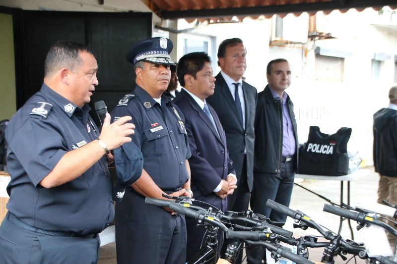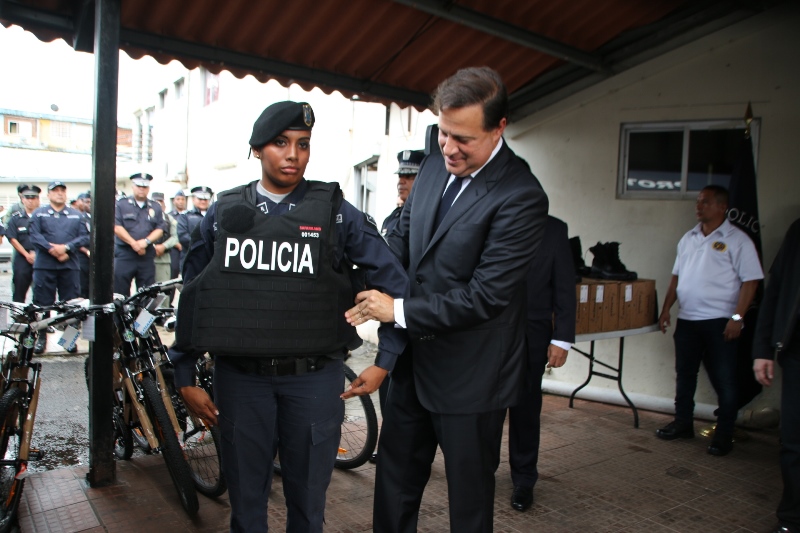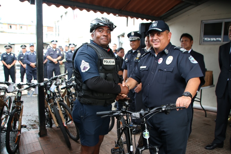Uniformados de la Policía Nacional de servicio en las zonas policiales de Colón y Arraiján fueron dotados por el Gobierno Nacional con bicicletas e implementos policiales, que les permitirá cumplir con el compromiso de brindar seguridad a todos los panameños. El propio Presidente de la República, Juan Carlos Varela Rodríguez estuvo presente el pasado miércoles 5 de octubre en la sede de la Zona Policial de Colón para entregar la dotación junto al Ministro de Seguridad Pública, Alexis Bethancourt, al Director General de la Policía Nacional, Omar Ariel Pinzón Marín y el Director del Consejo de Seguridad, Rolando López. El Presidente de la República, Juan Carlos Varela Rodríguez y el Ministro de Seguridad, Alexis Bethancourt coincidieron en la importancia de trabajar en conjunto, por lo que se reforzarán las acciones en materia de seguridad. El Director General Omar Pinzón, destacó que en todas las zonas se estarán entregando estos equipos de seguridad, por lo que agradeció al Presidente y al Ministro de Seguridad Pública, por la preocupación de equipar a la fuerza pública con estos equipos, necesaria para cada una de las unidades. Fueron unos 400 chalecos, 863 pares de botas, 30 bicicletas tipo montañera cada una con su respectivo equipo de protección, las que se entregó a los uniformados de servicio en la provincia de Colón. En tanto, en el distrito de Arraiján (13va Zona de Policía) el Director General de la Policía Nacional, Omar Ariel Pinzón Marín entregó equipos tácticos, como botas y chalecos antibalas, además de bicicletas con sus respectivos cascos de protección a unidades. En esta zona policial se implementará el Servicio de Policía Ciclista como parte del compromiso de la Policía Nacional de brindar seguridad a este distrito. Luego de la entrega, el Director General de la Policía Nacional junto al Subdirector de Asuntos Penitenciarios, David Ramos y el Comisionado Luis Navarro, jefe de la 13va Zona de Policía de Arraiján, recorrieron la subestación para escuchar a los uniformados. |
