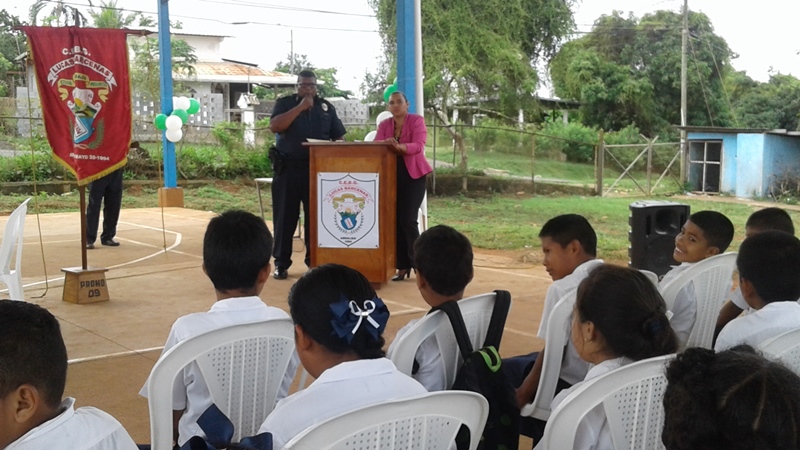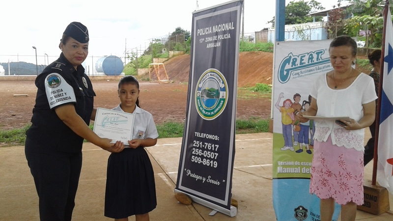 Los estudiantes del Centro Básico Lucas Bárcenas en Burunga dijeron “no a las pandillas” al finalizar este jueves 13 de octubre el programa de entrenamiento en educación y resistencias a las pandillas G.R.E.A.T. Fueron un total de 184 niños de cuarto y séptimo grado, quienes recibieron sus respectivos diplomas durante una ceremonia que fue presidida por el Comisionado Luis Navarro, jefe de la Treceava Zona Policial de Arraiján, quien los felicitó por la culminación del curso y los instó para que fueran agentes multiplicadores y pusieran en práctica los conocimientos adquiridos entre sus compañeros, amigos y vecinos El programa contó con la participación de tres niños de ese plantel quienes alegraron a los presentes con poemas y canto de décimas en la que hacían un llamado a rescatar los valores y decirle no a las pandillas. Posteriormente, los invitados especiales hicieron entrega de los diplomas de finalización de curso. |