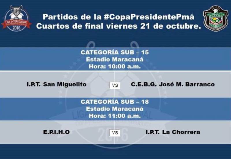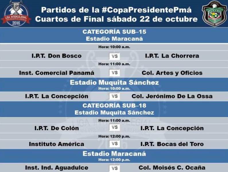 Este viernes 21 de octubre inicia la jornada de cuartos de final de la Copa Presidente de la República y los dieciséis equipos que disputarán estos ocho partidos ya están listos. Este martes 18 de octubre se llevó a cabo el sorteo de los equipos que iniciarán los partidos, en un acto que se llevó a cabo en las instalaciones del Ministerio de Educación, ubicada en Ciudad del Saber. Con la presencia de Autoridades del Ministerio de Educación, Instituto Panameño de Deportes (PANDEPORTES), miembros de la Policía Nacional quienes representan a los equipos clasificados, el sorteo de las categorías Sub 15 y Sub 18 se dio de esta manera: Categoría Sub 15 I.PT. San Miguelito Vs C.E.B.G. José M. Barranco I.PT. Don Bosco Vs I.PT. La Chorrera Inst. Comercial Panamá Vs Col. Artes y Oficios I.PT. La Concepcion Vs Col. Jerónimo De La Ossa Categoría Sub 18 I.PT. De Colón Vs I.PT. La Concepción Instituto América Vs I.PT. Bocas del Toro Instituto Ind. Aguadulce Vs Colegio Moisés Castillo Ocaña E.P.I.H.O Vs I.PT. La Chorrera Los torneos fueron programados en horarios matutinos y vespertinos, los días viernes y sábado en los estadios: Maracaná y Muquita Sánchez de la Chorrera, en donde se escogerán a los mejores 4 equipos de ambas categorías que se disputaran en semifinales.