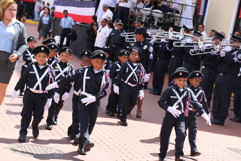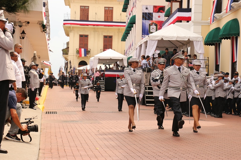 Todos los años, los hombres y mujeres de la Policía Nacional le rinden honor a la Patria, siendo esta delegación una de las más esperadas por el público que asiste en los desfiles. Con movimientos perfectamente coordinados, su elegancia y porte, arranca los aplausos de nacionales y extranjeros, que con entusiasmo hacen un alto para disfrutar de la festividad. Para el comisionado y jefe de Seguridad Ciudadana, Rafael Álvarez, quien es encargado de supervisar cada detalle, las prácticas son arduas pero necesarias para ofrecer una presentación de alto nivel. Y es que ser parte de la delegación y representar a la institución de seguridad es un orgullo, como el honor de servir al país. La Subcomisionada Zilma Real, quien dirige el Pabellón femenino, expresó que es un honor ser parte de este grupo de uniformadas que con su donaire y belleza expondrán el rostro dulce de la institución. Para esta ocasión, la Banda de Música de la Policía Nacional tiene un amplio repertorio de temas que resuenan en la mente y corazón de los panameños. Su Director Musical, el Profesor Vicente Elcock dijo que se interpretaran temas nuevos y los ya conocidos, Panamá Primero y Viva Panamá. El cabo 1° Franklin Jaramillo, quien es Tambor Mayor, tiene la responsabilidad de encabezar la Banda de Música. Todos sus movimientos deben ser bien calculados y armónicos. Lograr esto requiere muchas horas de práctica. Él sabe que todos lo observan, así que pone todo su empeño. “Es un orgullo para mi integrar esta delegación y para mi familia es motivo de mucha alegría, por lo que siempre me apoyan”. Para esta ocasión, la Banda de Música de la Policía Nacional tiene un amplio repertorio de temas que resuenan en la mente y corazón de los panameños. Pese al cansancio que puede significar las horas de preparación, la satisfacción de lograr posesionar a la Policía Nacional como una de las delegaciones favoritas por grandes y chicos, es una de las más gratificantes, tanto como la vocación de servir a la comunidad.