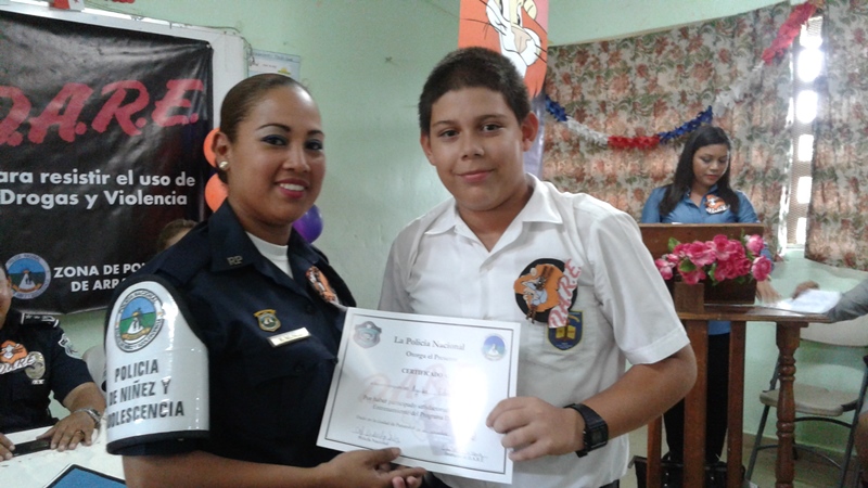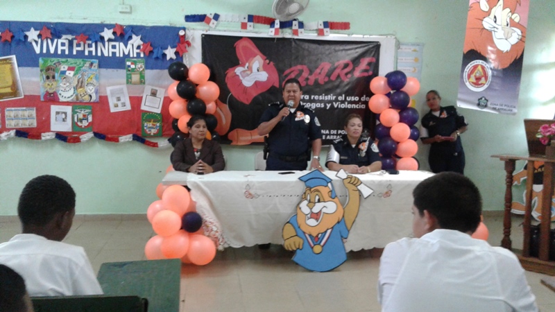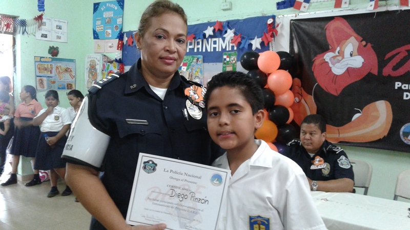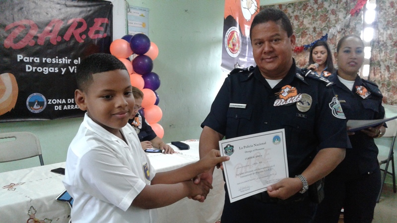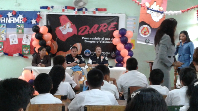 Un total de 120 estudiantes de la escuela Leonidas Delgado en Chapala distrito de Arraiján recibieron sus diplomas de culminación del programa D.A.R.E. (Para Resistir las Drogas y la Violencia). La ceremonia de entrega de diplomas se realizó este jueves 17 de noviembre en la que participó el Comisionado José Flores, Ejecutivo de la Treceava Zona Policial de Arraiján. La Profesora Mayra Espinoza en representación de la escuela, la señora Heydi Distancia, Vicepresidenta del Club de Padres de Familia y la niña Edys Palacios del VB agradecieron a la Policía Nacional por haber tomado en cuenta este plantel para la implementación de este programa. Se aprovechó la oportunidad para solicitarle a las unidades de la Policía de Niñez y Adolescencia tomar seguir con los programas de prevención. El Comisionado Flores felicitó a los participantes a quienes invitó a poner en práctica los conocimientos aprendidos durante cuatro meses y a que sean agentes multiplicadores entre sus compañeros, amigos y vecinos. |