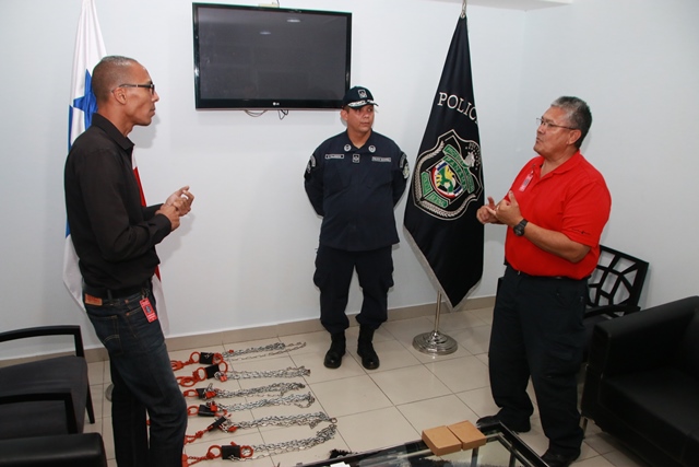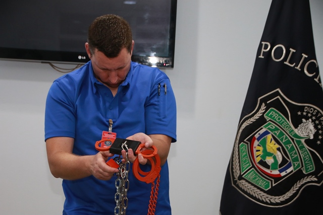 Unidades de la Policía Nacional de servicio en la Subdirección General en Asuntos Penitenciarios, recibieron una donación consistente en implementos de trabajo. La entrega la realizó Archibold Alleyne, asistente del Programa de sección de asuntos Anti-narcóticos y Aplicación de la ley de la Embajada de los Estados Unidos y fue recibida por el subcomisionado Oscar Villanueva, de la Subdirección General en Asuntos Penitenciarios de la Policía Nacional. Se trata de esposas para los pies y mano, utilizadas para la población penitenciaria en Panamá. Unas 20 unidades policiales de servicio en los centros penitenciarios de La Joya, La Joyita y La Gran Joya recibieron previamente seminario por parte de Los instructores Andrew Langdon y Lou Archuleta, ambos del Departamento de Corrección de Colorado Springs con el apoyo de Fernando Fernández, traductor de la Embajada de los Estados Unidos. |