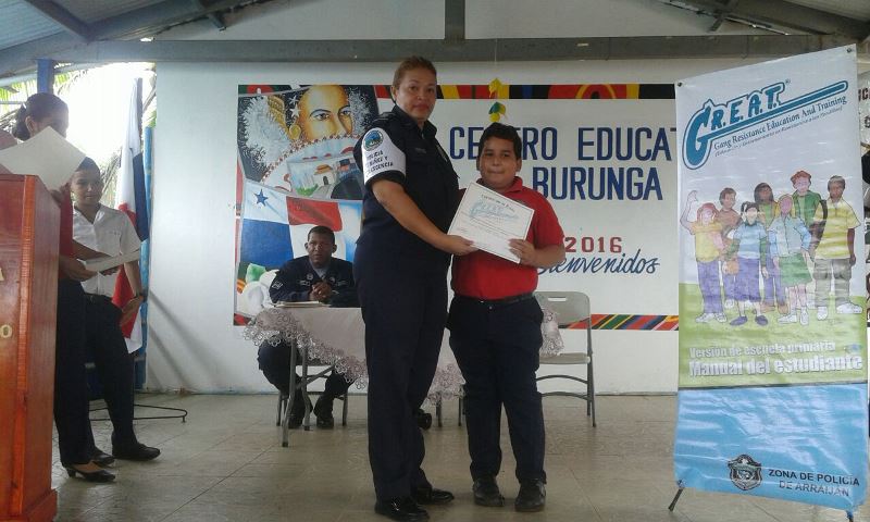 Un total de 241 estudiantes de quinto y sexto grado de la Escuela Burunga en el distrito de Arraiján, culminaron este viernes 25 de sus diplomas de culminación del programa de Educación y Entretenimiento en Resistencia a las Pandillas (G.R.E.A.T) La ceremonia de entrega de diplomas se realizó en el gimnasio de la escuela y fue presidida por el Mayor Juan Joseph, Jefe del Área A en representación del Jefe de la Treceava Zona Policial, Comisionado Luis Navarro, quien al hacer su intervención felicitó a los estudiantes por haber participado en este curso que tuvo una duración de 4 meses. El programa fue impartido por el Subteniente José Ripamonte, del Servicio de Niñez y Adolescencia.