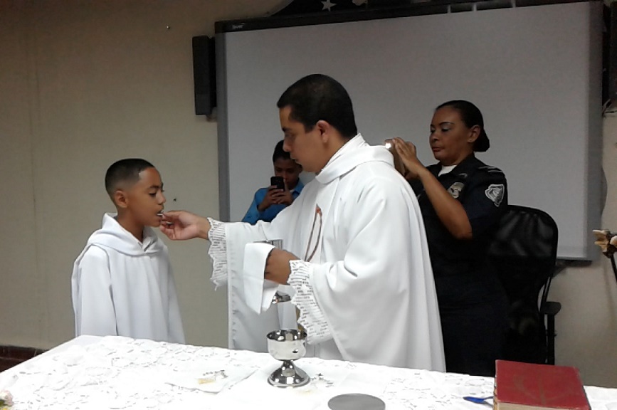 Un total de 10 niños y niñas hijos de unidades de la Policía Nacional recibieron el sacramento de la comunión, en el salón de conferencia de la Zona de Policía de Herrera, donde igualmente se celebró la eucaristía, presidida por el Presbítero Daniel Mora; capellán de la Sexta Zona Policial. Al acto religioso asistieron padres, madres y demás familiares de los niños, al Igual que unidades policiales de Niñez y Adolescencia, Seguridad Ciudadana y la oficial de turno. En la actividad se agasajó a los 10 niños, involucrado en el recibimiento del santo sacramento, con un almuerzo junto al maestro de Catequesis. |
