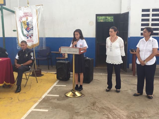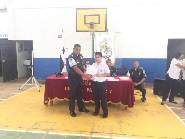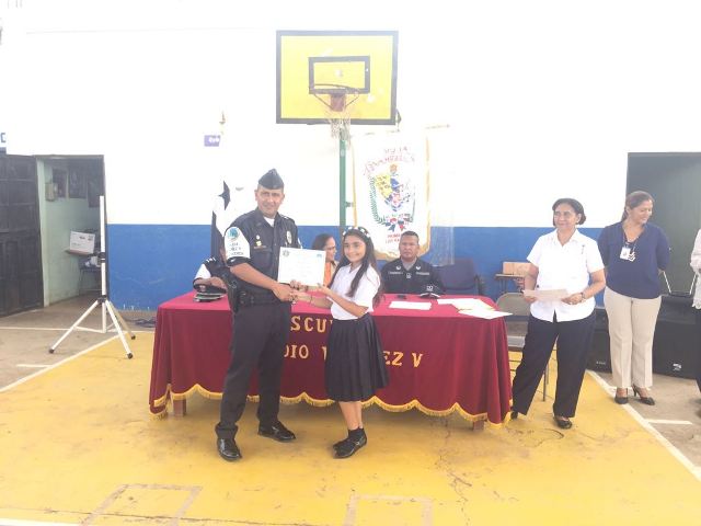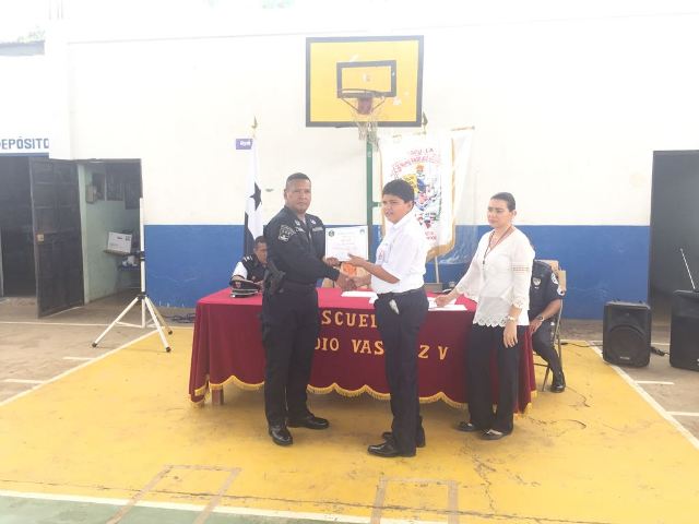 Con gran alegría, estudiantes de la escuela Claudio Vásquez en Las Tablas, culmina el programa de Prevención de Educación para la Resistencia al Uso y Abuso de las Drogas y la Violencia (DARE). Más de 125 Estudiantes de 6to grado culminaron con éxito el programa DARE, quienes agradecieron a la Policía Nacional por el tiempo invertido en ellos y por todas las enseñanzas que les fueron impartidas. En este pequeño pero significativo acto de graduación estuvieron presentes, la directora del plantel la profesora Celideth Peralta, el Comisionado René Herrera, ejecutivo de la 7ma Zona Policial de Los Santos, el Teniente Fernando García, encargado del Departamento de Niñez y Adolescencia en Los Santos, el Sargento Oscar Guerra, Facilitador de este programa, Maestros y Padres de familia.