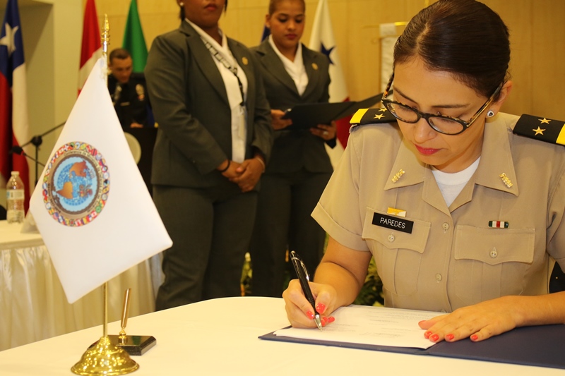 Promover programas que fortalezcan la igualdad de género y la participación de las mujeres en las entidades de seguridad, son parte de los objetivos acordados en el taller “Incorporación Progresiva de la Perspectiva de Género como Eje Transversal de las Políticas de Defensa y Seguridad”. Durante la clausura de este evento, surgido de la XIII Conferencia por los Ministros de Defensa y Seguridad plasmados en el acuerdo N° 27 de la “Declaración de Puerto España”, se destacó el esfuerzo de los países participantes de lograr las metas propuestas y continuar trabajando en conjunto. El Viceministro de Seguridad, Jonathan Del Rosario dijo que Panamá, a través del ministerio de Seguridad y otras entidades continuara facilitando los trabajos de estas cumbres e impulsando las acciones que fortalezcan los acuerdos y objetivos en común. Por su parte, la Comisionada y Directora Nacional de Gestión y Proyectos de la Policía Nacional, Oris Jaén, presidenta Ad Hoc, mencionó que el taller abrió el espacio de diálogo, lo que fue muy positivo para el intercambio de experiencias en materia de género y organizar el grupo de trabajo para cumplir con los acuerdos. Durante el Taller internacional, que se realizó del 20 al 22 de septiembre en la sede del Parlamento Latinoamericano (Parlatino), los representantes de las delegaciones policiales, militares y navales de Bolivia, México, Nicaragua Canadá, Chile, Brasil, Perú, Belice, Estados Unidos, Guatemala, Panamá, Honduras y Haití, expusieron los avances y pendientes sobre el tema. Aquí se resaltaron los aportes de las mujeres en pro de la seguridad, la importancia de conocer las capacidades de hombres y mujeres, en igualdad de oportunidades para ejercer cargos de jerarquía, lo que además de potenciar el recurso humano robustece a los estamentos de seguridad y defensa. Al final, se entregaron los certificados de participación y obsequios, además de la firma de actas.