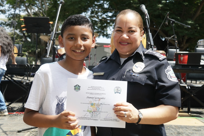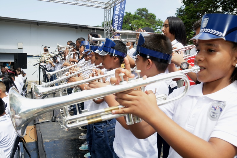 Con una demostración de lo aprendido, 135 niños, niñas y adolescentes culminaron el programa de Verano Feliz Musical que lleva a cabo la Policía Nacional a través de la Banda de Música. Canciones como: Que me falte todo de Zuleika Barreiro, Échame la culpa de los cantantes, Luis Fonsi y Demi Lovato y un mix de música panameña, fueron interpretada por estos pequeños artistas. Quienes se unieron a esta mañana musical, fueron los jóvenes de la Banda de Música del Colegio Rufo Garay de la provincia de Colón, ellos pertenecen a un plan piloto que realiza la Policía Nacional en conjunto con el Departamento de Seguridad Ciudadana y el Servicio de la Policía de Niñez y Adolescencia. Los aplausos no se hicieron esperar, los padres de familia, orgullosos observaban y se admiraban de las habilidades ocultas en sus hijos. La comisionada Elida Ortega, jefa de la Dirección de Bienestar Policial y Familiar, hizo entrega de los certificados. Por espacio de un mes, los estudiantes recibieron clases de Saxofón, Violín, Piano, Trompeta y Trombones, desarrollando en ellos el arte de la música. Dentro del curso los instructores, les refuerzan los valores, la importancia de la disciplina, entre otros temas, que contribuyen a fortalecer su formación integral. Desde el año 2005 la Policía Nacional realiza el Verano Feliz Musical, programa que toma como principal pilar a los niños, niñas y adolescentes, que serán los hombres del mañana y así vivir en ambientes de sana convivencia. |