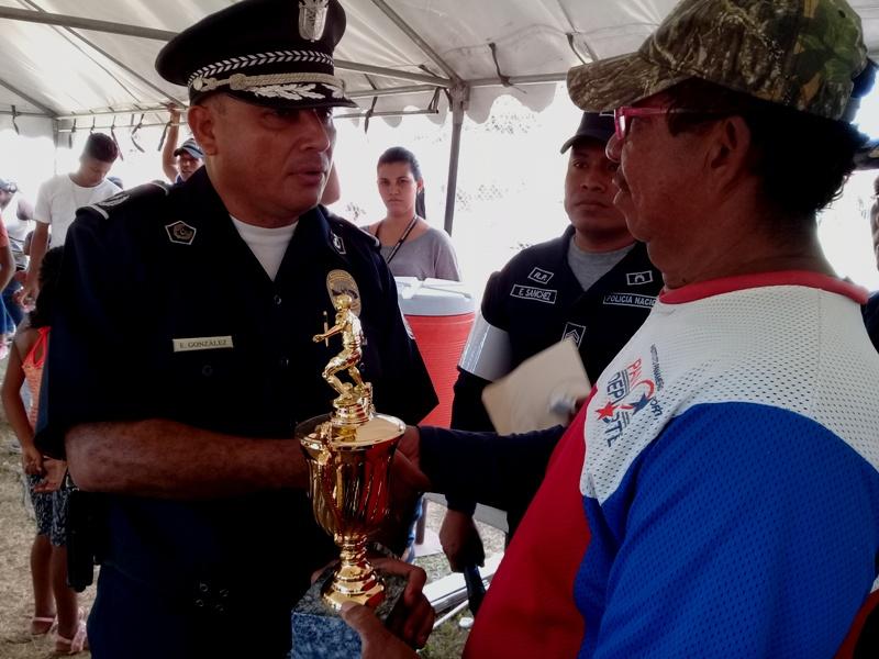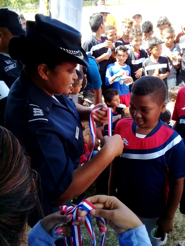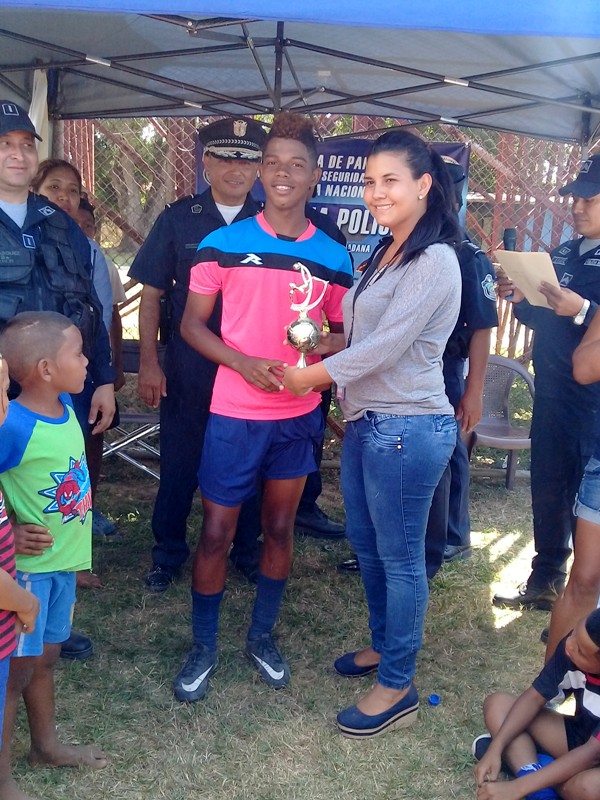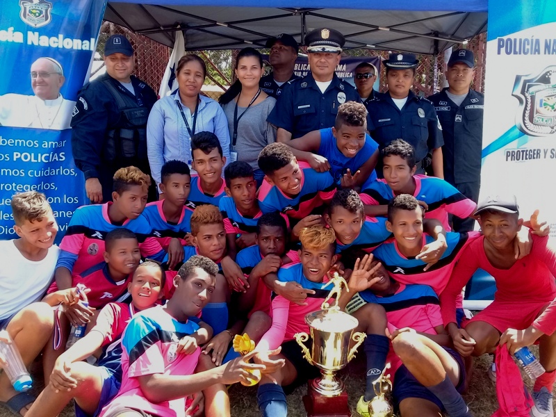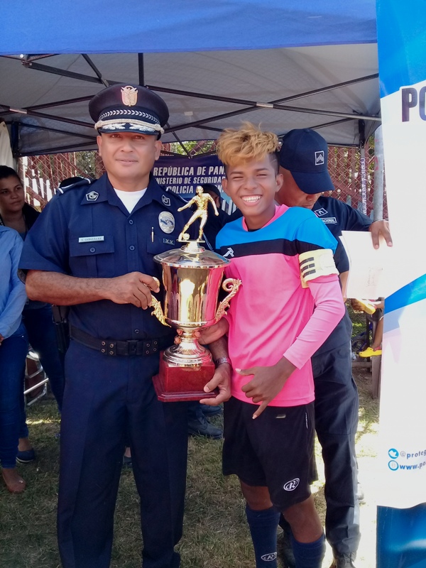 Con la asistencia de padres de familias y aficionados al futbol se llevo a cabo en el sector de La Frontera en Rio Hato distrito de Antón, la clausura del Torneo Manuel Villanueva", Copa "Verano Feliz" organizado por la Policía Nacional. En el mismo se dieron presentaciones folklóricas por el grupo de baile y tradiciones de la lotería Nacional, exhibiciones de canes por el Grupo Juvenil Canino colaborador de la Policía, juegos inflables, pinta caritas y cortes de cabello. Actividad que conto con la presencia del Comisionado Aníbal Prados jefe de la Zona Policial, el mayor Edgar González encargado del área de Antón, el subteniente Eric Vásquez encargado de Seguridad Ciudadana de la Zona Policial, el sargento Algis Bethancourth, sargento Jerónimo Vissueti , autoridades invitadas y patrocinadores que apoyaron para que se diera este evento. Para el comisionado Aníbal Prados, detallaba que el objetivo principal de estos eventos es la prevención y la seguridad de los niños en ambientes más sanos, practicando deporte, afirmo el oficial. Además exhorto a los pequeños a permanecer con ese ímpetu en el deporte, a no abandonar sus estudios y agradeció a todos los directivos por la distinción y las colaboraciones brindadas. Por su parte el Sargento Bethancourth, manifestó lo orgulloso de ser partícipe de estas actividades deportivos, el cual es muy importante para el crecimiento cultural y físico de los niños. En el evento se entregaron trofeos, medallas, obsequios a los equipos ganadores, así como a los mejores jugadores. |