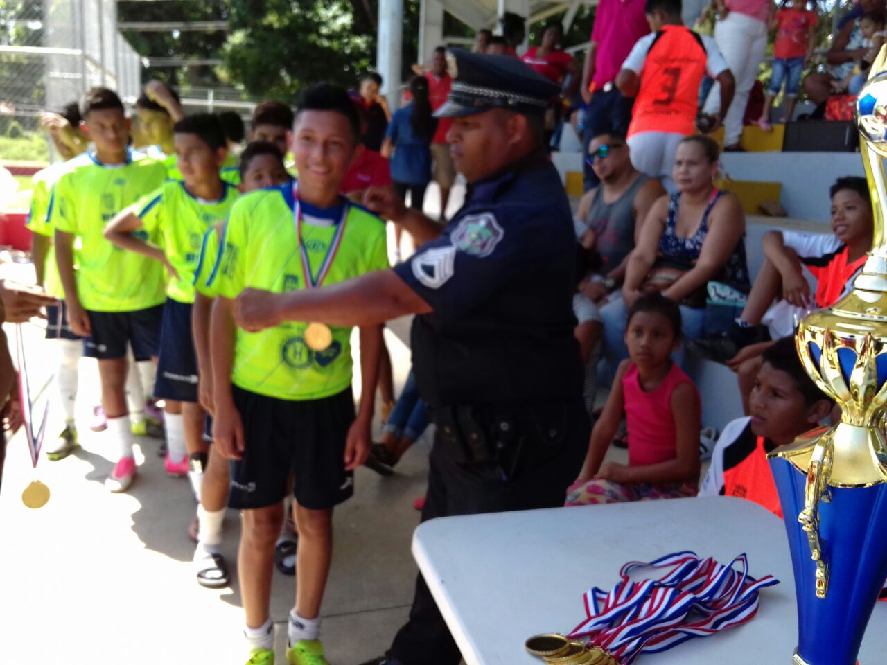 El día de hoy viernes 23 de febrero se llevó cabo la clausura del Torneo Mundial de Barrio 2018 dirigido por la Policía Nacional, con la participación de equipos de diferentes comunidades en las categorías sub 13 y sub-15. Nuestro objetivo es lograr que estos jóvenes se alejen de las drogas y no sean arrastrados por actividades delictivas, manteniendo como distracción el deporte y descubran su capacidad en esta disciplina deportiva. La final de este evento se desarrolló en la Cancha Sintética Las Mercedes de Finca 4 en donde resultó campeón en la categoría sub 15 el equipo de Finca 42 llevándose el trofeo del primer lugar, de igual manera se entregaron medallas a los equipos participantes. |