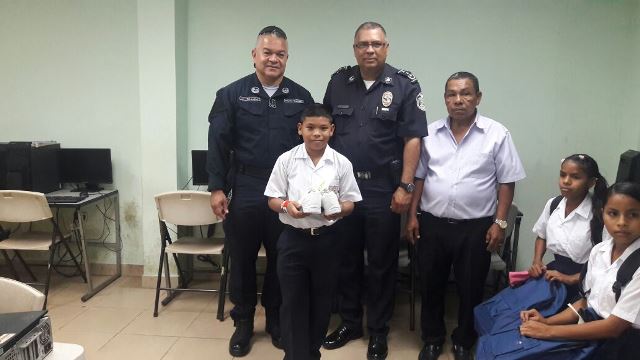 Unidades de la Policía Nacional de servicio en el Departamento de Seguridad Ciudadana de la 15va Zona Policial hicieron entrega de Mochilas escolares, zapatillas y libros a estudiantes de escasos recursos de la Escuela Santa Cruz, en Cerro Bandera, corregimiento de Pedregal. Se contó con la presencia del Comisionado Jorge Miranda jefe de la zona; Comisionado Ricky González, Jefe del Área “B” Pedregal, quienes le hicieron la entrega a los estudiantes de sus nuevos útiles escolares y los exhortaron a continuar sus estudios. Los directivos de la escuela se manifestaron estar muy agradecidos con la Policía Nacional por el apoyo incondicional que se les brinda a los estudiantes. |