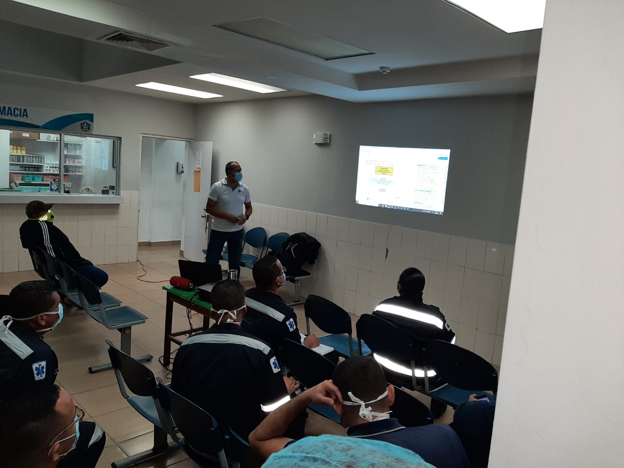 La medicina es un mundo en constante cambio y debido a la pandemia que afrontamos por el nuevo coronavirus (Covid-19), es esencial la actualización de normas sanitarias e higiénicas a los profesionales de la salud. Temas como la revisión de algoritmos de paro cardiaco en adultos, con sospecha o pacientes confirmados de Covid-19 entre otros, formaron parte de la capacitación dictada por el Licenciado Henry Staples del Ministerio de Salud al personal médico, enfermería y unidades prehospitalarias de la Policía Nacional. El Departamento de Bienestar Laboral, Policial y Familiar en conjunto con servicios médicos, se mantendrán en constantes seminario y capacitaciones al personal de salud de esta institución para estar a la vanguardia de la batalla contra el Covid-19.