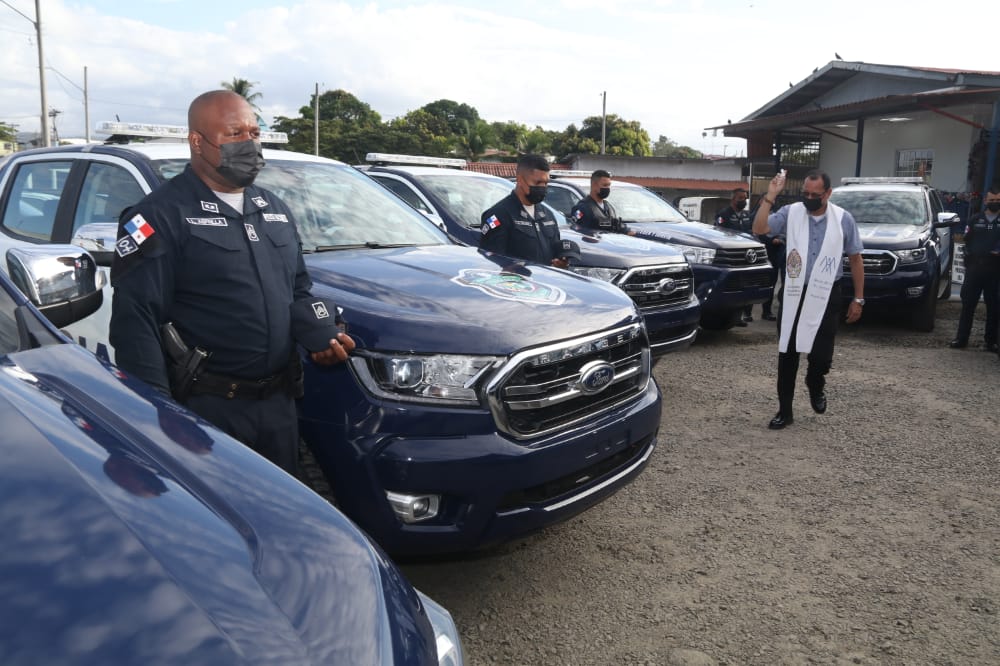 El ministro de Seguridad Pública, Juan Manuel Pino junto al Director General de la Policía Nacional, John Dornheim, entregaron 15 vehículos, tipo pick up doble cabina, a la 11va. Zona Policial de San Miguelito, para reforzar la vigilancia policial en el distrito.