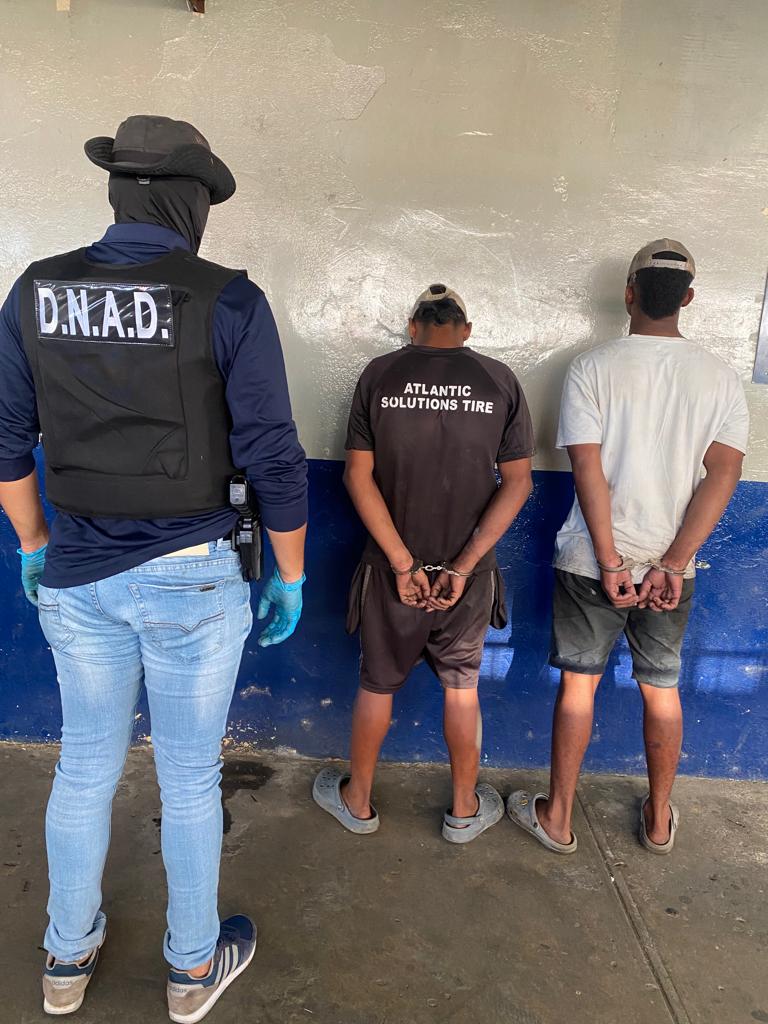 Los ciudadanos de 20 y 21 años, fueron aprehendidos por microtráfico en el corregimiento de Buena Vista, Sector de El Giral donde se le decomisaron 6 envoltorios plásticos transparentes que en su interior mantenían materia vegetal seca que se presume sea sustancia ilícita, seis recortes de carrizos plásticos transparente sellados que en su interior mantenían polvo blanco que se presume sea cocaína, B/. 85.25 en efectivo y un cigarrillo de fabricación casera que se presume contenga hierba seca.
