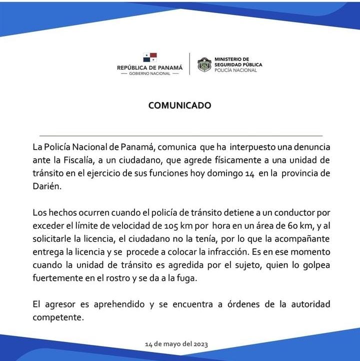 La Policía Nacional de Panamá, comunica que ha interpuesto una denuncia ante la Fiscalía, a un ciudadano, que agrede físicamente a una unidad de tránsito en el ejercicio de sus funciones hoy domingo 14 en la provincia de Darién. Los hechos ocurren cuando el policía de tránsito detiene a un conductor por exceder el límite de velocidad de 105 km por hora en un área de 60 km, y al solicitarle la licencia, el ciudadano no la tenía, por lo que la acompañante entrega la licencia y se procede a colocar la infracción. Es en ese momento cuando la unidad de tránsito es agredida por el sujeto, quien lo golpea fuertemente en el rostro y se da a la fuga. El agresor es aprehendido y se encuentra a órdenes de la autoridad competente |