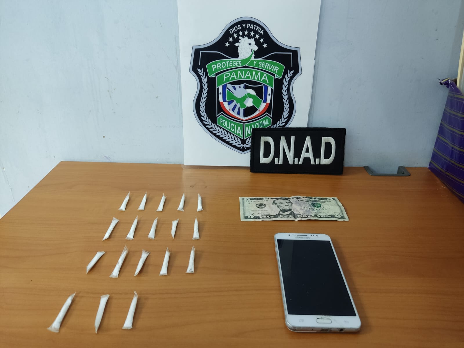 En las diligencias de allanamiento en conjunto con el Ministerio Público en el corregimiento de Belisario Frías, sector de Torrijos Carter, las unidades ubican 18 carrizos plásticos transparentes contentivos con polvo blanco que se presume cocaína, B/. 5.00 en efectivo y un teléfono celular.
