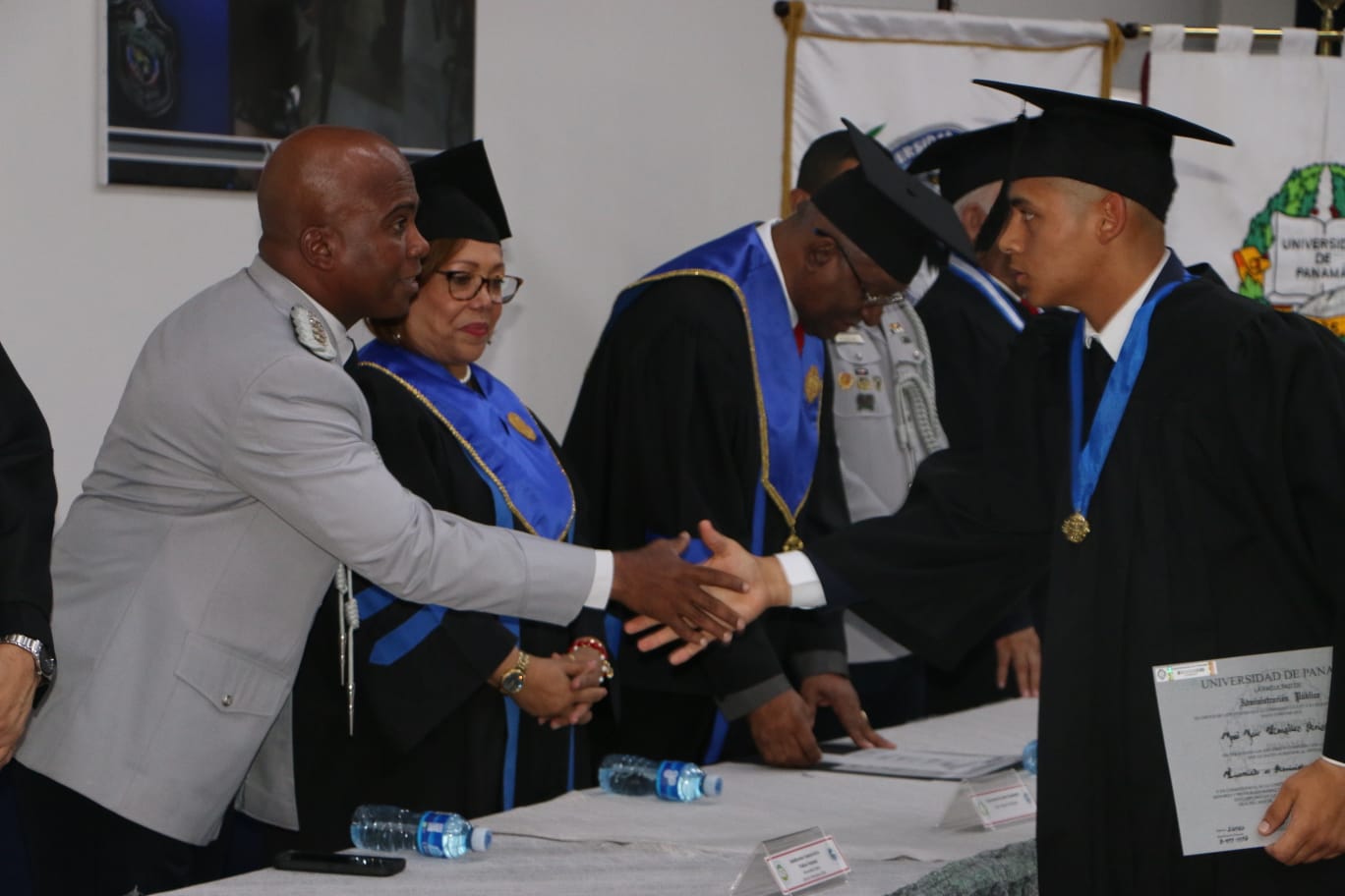 Luego de 4 años de sacrificio y entrega, ocho alféreces entre ellos una femenina de la Escuela de Oficiales Dr. Justo Arosemena (ESOPOL), recibieron este jueves, 14 de diciembre sus diplomas que los acreditan como Licenciados en Administración Pública Policial de la Universidad de Panamá. La ceremonia se realizó en el auditorio del Instituto Superior Policial (ISPOL), ubicado en Gamboa, con la presencia del Subdirector General de la Policía Nacional, Simón Henríquez , miembros del Directorio Policial, así como de las altas autoridades de la Universidad de Panamá y de la Facultad de Administración Pública. “Esta es una carrera noble, agradezco a la Universidad de Panamá, a los docentes y también a la Policía Nacional por preparar a estos estudiantes para brindar seguridad a nuestros ciudadanos, desearle éxitos en un ambiente operacional cambiante, nuestra recompensa es garantizar la paz y la sana convivencia ciudadana” dijo el Subdirector de la Policía Nacional, Simón Henríquez , en su intervención. El Subcomisionado Francisco Castro, Jefe de la Escuela de Oficiales de Policía, detalló que ya son 23 años que se mantiene este convenio con la Universidad de Panamá, y que ha sido de gran beneficio académico para los nuevos subtenientes de la Patria. Entre los nuevos licenciados, se destacan los primeros tres puestos: Rosa Arrocha , Addiel Rodríguez y José Ulloa respectivamente. Las personas que obtienen la Licenciatura en Administración policial están formadas para ejercer la gestión de planificación, organización, toma de decisiones, estadística y realización de planteamientos estratégicos aplicados con gran liderazgo en conformidad con la figura uniformada. |