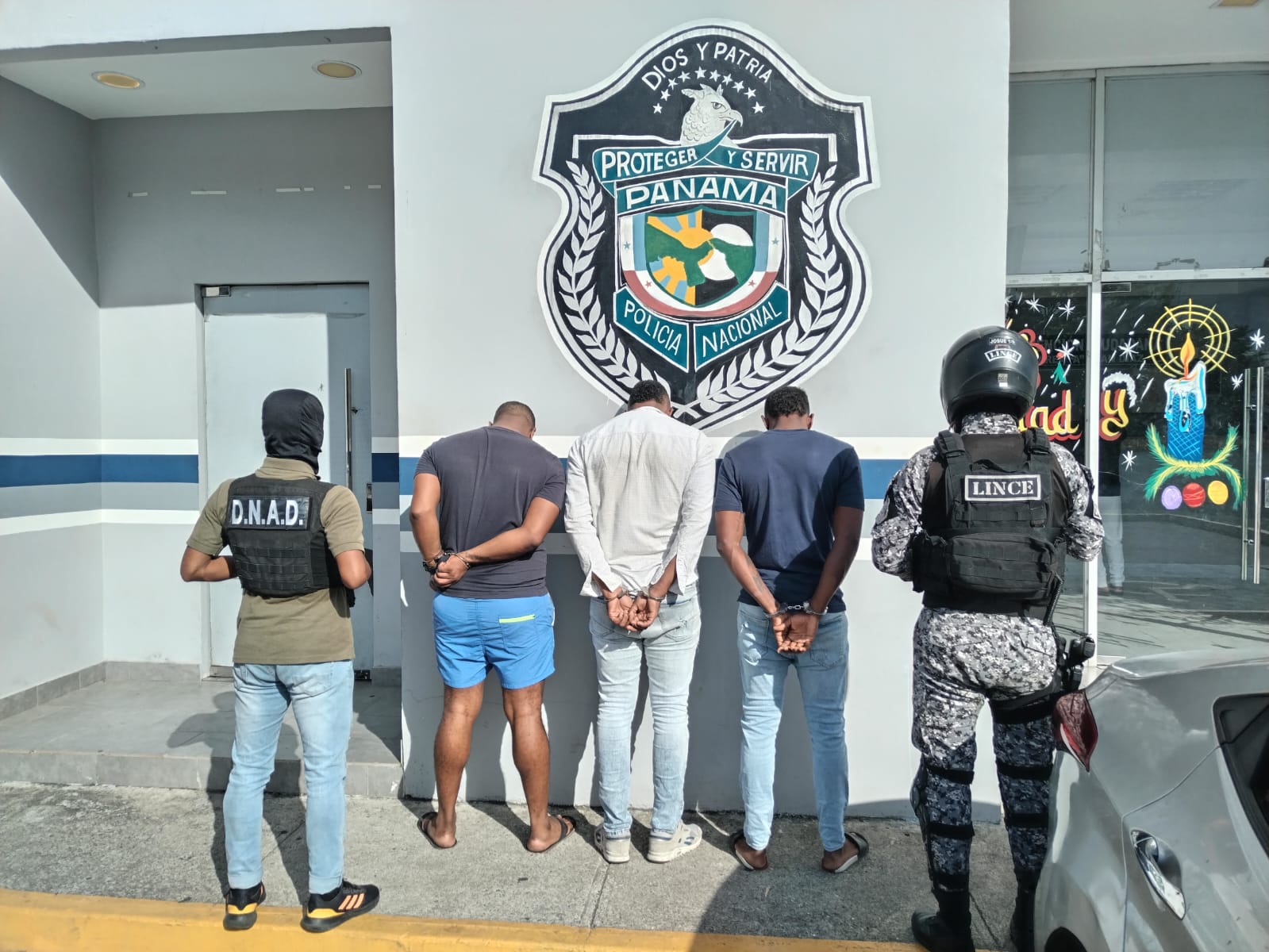 Unidades de la Policía Nacional aprehenden a tres personas, todas de nacionalidad panameña por el presunto delito de Posesión Agravada de sustancias ilícitas, arma de fuego y municiones. La acción policial se realizó en los estacionamientos de un comercio dedicado al alquiler de locales para depósito de mercancías ubicado en el corregimiento de Juan Díaz. Entre los indicios recuperados se encuentran tres paquetes forrados con cinta adhesiva con presunta marihuana, además de una bolsa plástica con hierba seca, además de un arma de fuego tipo pistola con un proveedor con 13 municiones y cinco celulares. Igualmente se recuperaron dos vehículos tipo sedán. |