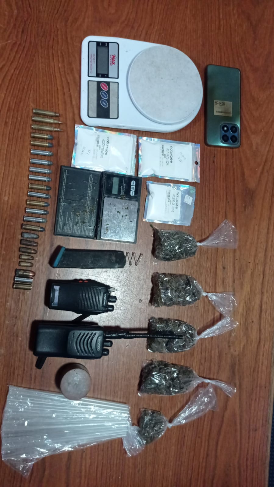 POLICÍA APREHENDE A UNA PERSONA Y LE DECOMISAN PRESUNTA DROGA Y MUNICIONES EN LA CHORRERA. Unidades de la Policía Nacional aprehenden a un ciudadano de 27 años, en posesión de presuntas sustancias ilícitas, tras una diligencia de allanamiento y registro realizada en coordinación con funcionarios del Ministerio Público, en La Chorrera. Dentro de la residencia se incautaron cinco bolsas transparentes que contienen hierba seca, presunta marihuana, una pesa digital, un proveedor de arma, 19 municiones, dos radios portátiles y un triturador. La acción policial se desarrolló en una residencia ubicada en el sector La Invasión del corregimiento Barrio Balboa, distrito de La Chorrera en la provincia de Panamá Oeste. |