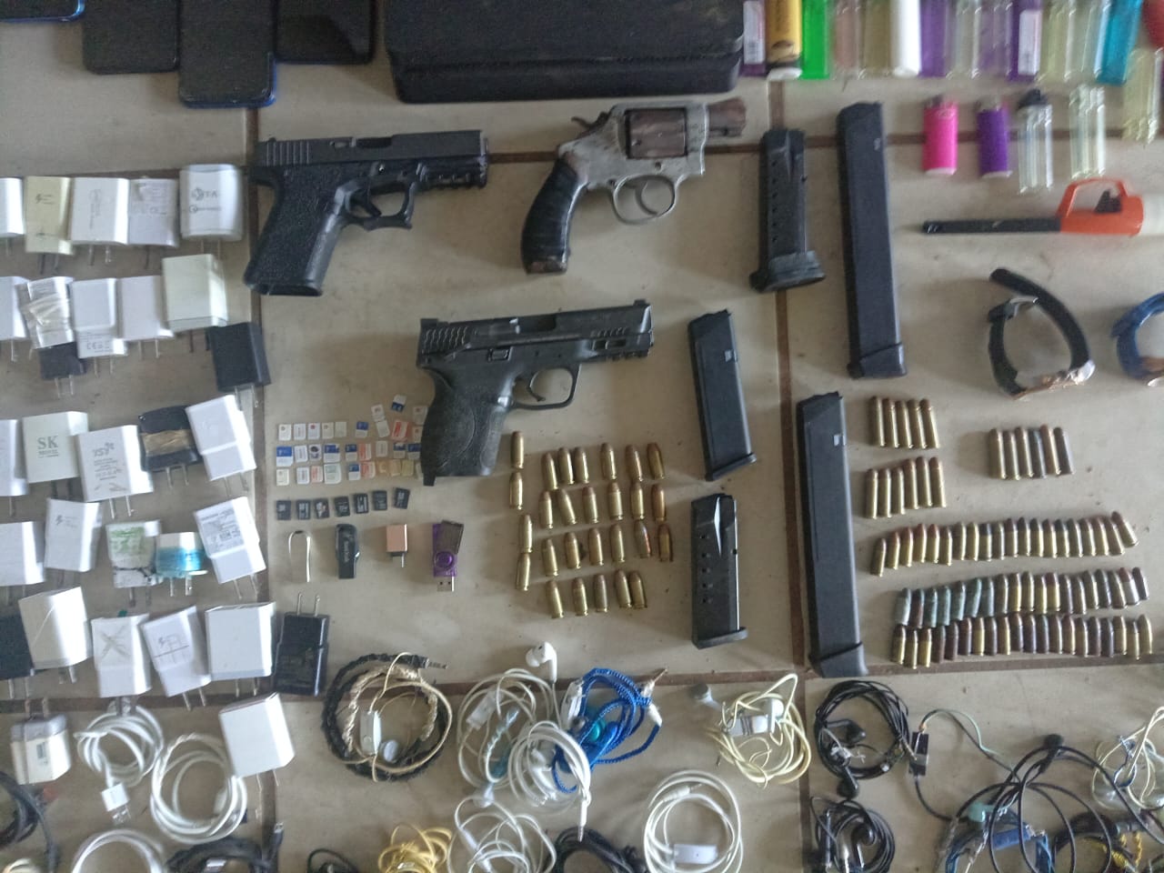 La Policía Nacional realizó el Operativo Armagedón III en los pabellones 1, 4 y 5 del Centro Penitenciario La Joya, en conjunto con la Fiscalía Especializada en Delitos Relacionados con Drogas. En esta acción policial se da con el hallazgo de varios artículos: tres armas de fuego Glock, calibre 9 milímetros, cinco proveedores de arma de fuego, además de 103 municiones de diferentes calibres. También se ubican B/ 3,362 en efectivo, 12 bolsitas con hierba seca, así como cinco bolsitas con polvo blanco, Se incluyen 102 teléfonos celulares de diferentes marcas y modelos, 106 cabezotes de cargadores ,119 USB y 194 objetos punzocortantes (platinas) entre otros. Todo lo decomisado será puesto a órdenes de la autoridad competente para los trámites correspondientes. |