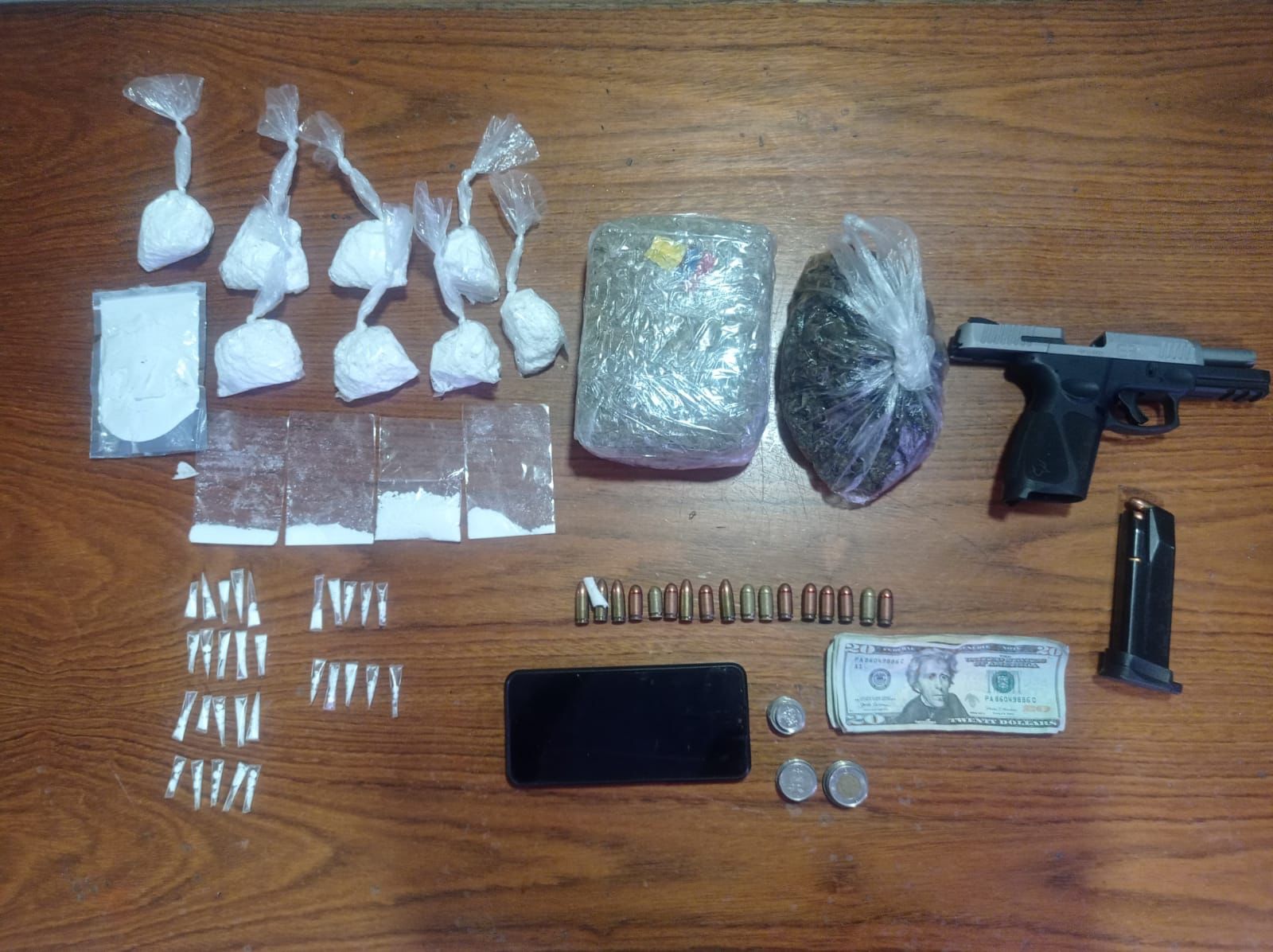 Durante la diligencia de allanamiento se aprehende a otro ciudadano a quien se le incauta un arma de fuego con 29 municiones en su proveedor. Así como, otros indicios, de estos una pesa digital, además de una bolsita transparente con hierba seca que se presume sea sustancia, en el Distrito de La Chorrera, Barriada Mendoza.