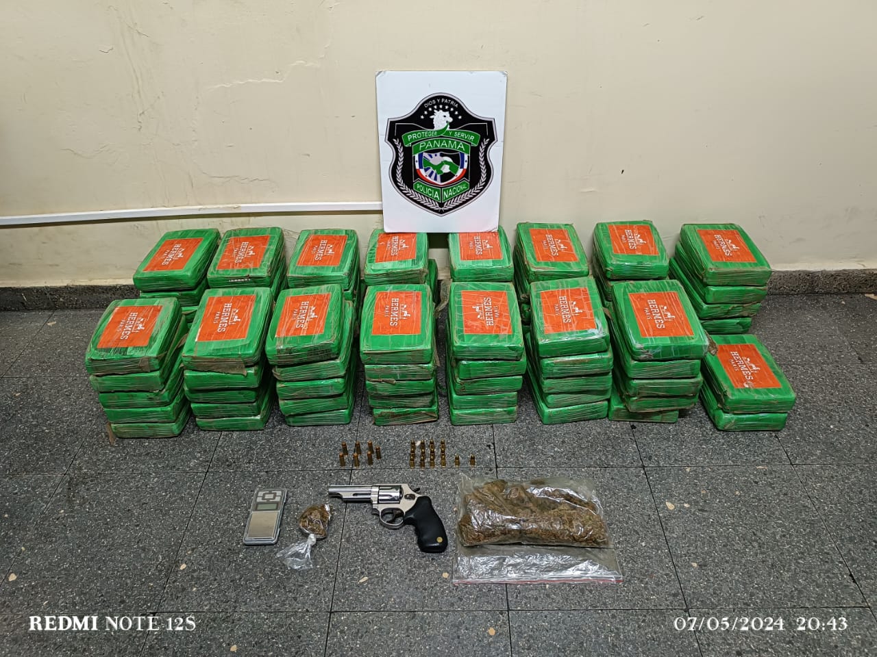 El Comisionado Edgardo Núñez, Jefe de la Zona Policial de Don Bosco, dijo que en la casa ubicada en la barrida Los Pilones, se ubican 77 Paquetes rectangulares de color verde forrados con cinta adhesiva transparente, 2 bolsas de plástico con hierba seca, 1 pesa digital, 1 arma de fuego tipo revólver calibre 38, 7 municiones calibre 38 y 14 municiones 9mm.