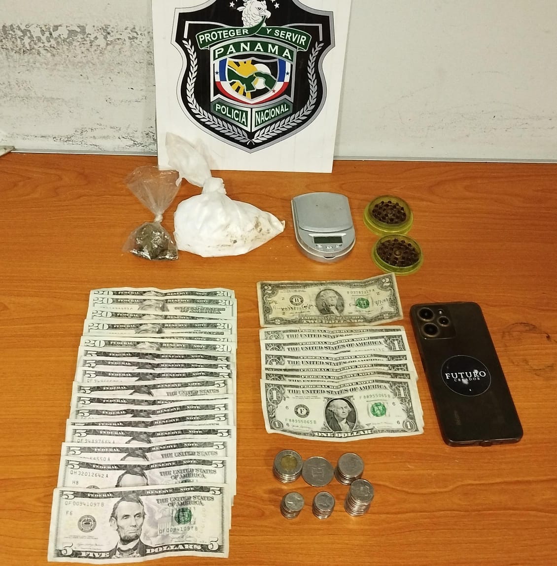 Unidades de la Policía Nacional aprehenden a dos personas de 22 y 35 años, en posesión de presuntas sustancias ilícitas, tras una diligencia de allanamiento y registro efectuada en conjunto con el Ministerio Público en el corregimiento de Las Mañanitas. La acción policial se desarrolló en el sector de La Colorada, corregimiento de Las Mañanitas. Cabe mencionar que al ciudadano de 35 años se le refleja un oficio de captura por el Delito de Pensión Alimenticia. Entre los indicios recuperados se encuentra una bolsa plástica con hierba seca, se presume sea marihuana, además de una bolsa plástica con polvo blanco, se presume sea cocaína, un teléfono celular color negro, una pesa digital, un triturador manual y 185 dólares en efectivo. Los aprehendidos, se trasladaron a la Sala de Atención Ciudadana de Las Mañanitas para los trámites correspondientes. |