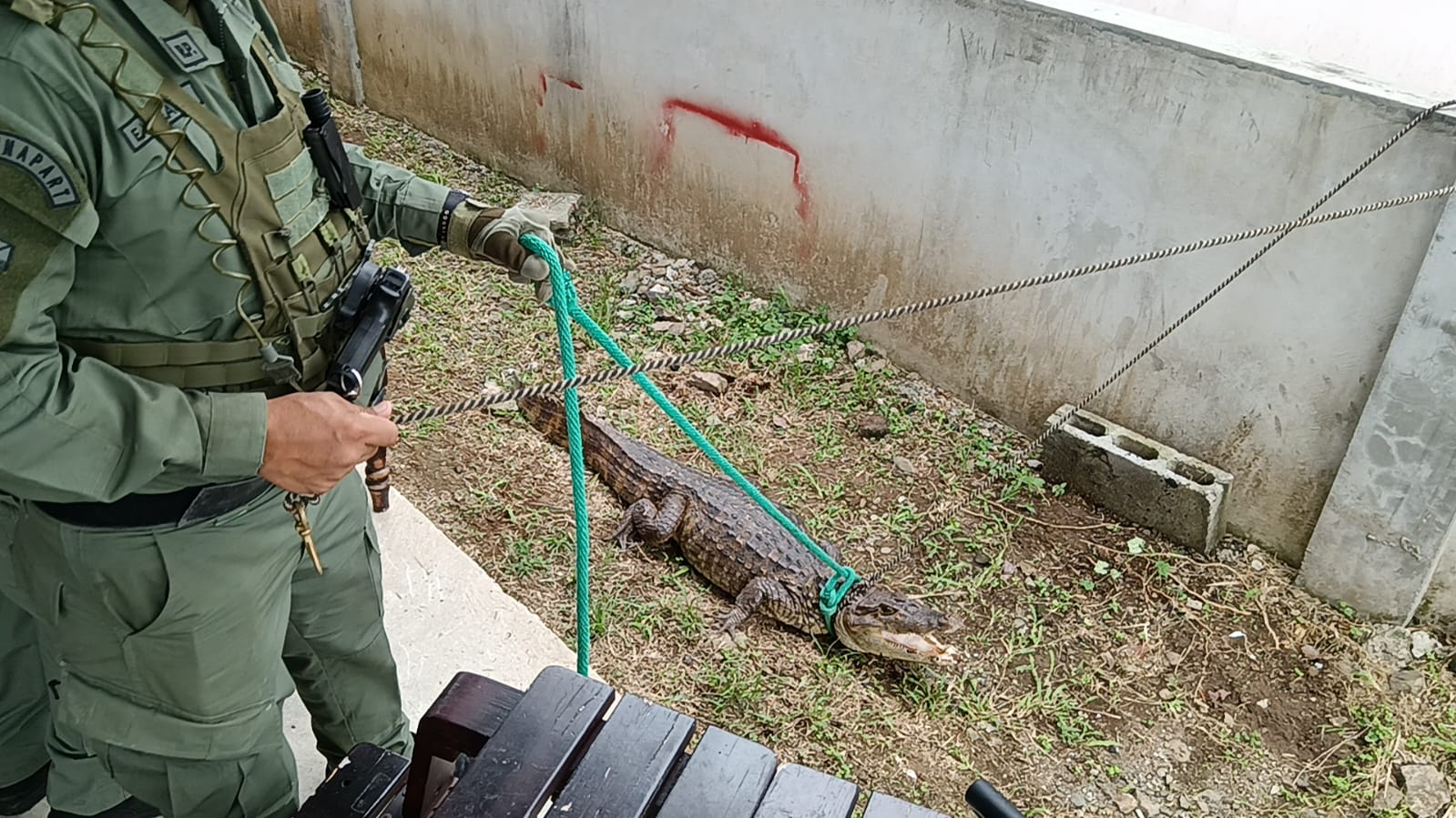 Tras una llamada de alerta unidades de la Policía Nacional se trasladaron hasta una de las residencias ubicadas en la barriada Colinas del Sol en el distrito de Arraiján donde se logra la captura de un caimán que se introdujo dentro del citado inmueble causando temor entre sus residentes. Al lugar se presentaron dos unidades de la Policía Ambiental quienes siguiendo los procedimientos de seguridad y conservación de la fauna panameña, logran acorralarlo, enlazarlo y atraparlo para finalmente colocarlo dentro de una jaula. El animal fue trasladado hasta un lugar seguro para su posterior reubicación en su hábitat. |