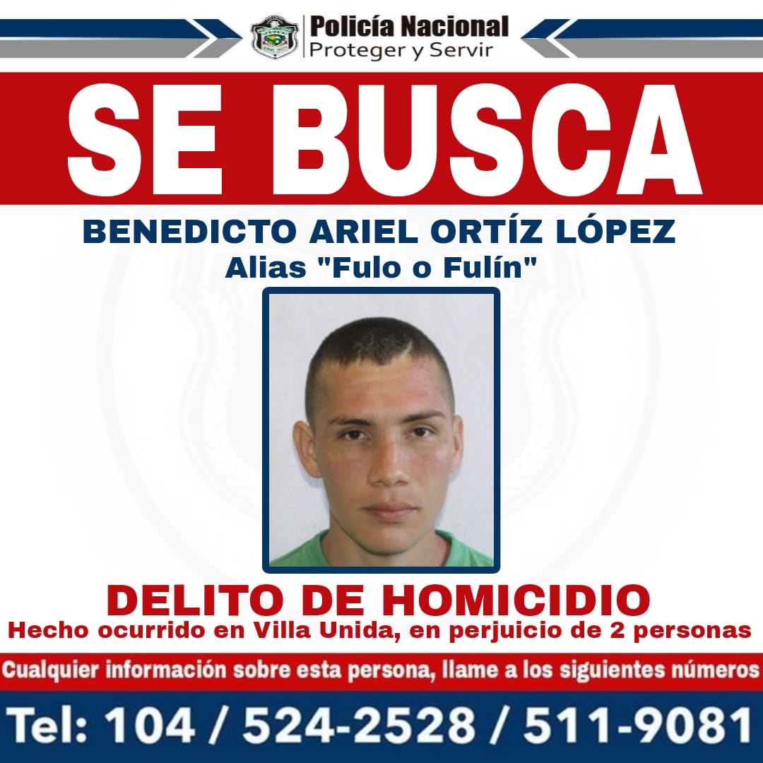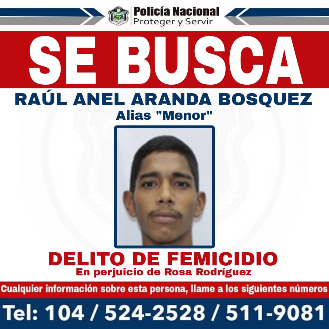 La Policía Nacional solicita la colaboración de la población en general a fin de dar con la aprehensión de personas vinculadas a investigaciones por el delito Contra la Vida y la Integridad Personal en su modalidad de Homicidio y Femicidio, hechos registrados en los últimos días. Entre los requeridos se encuentra, Raúl Anel Aranda Bósquez, alias “Menor”, investigado por la presunta comisión del delito de femicidio, en perjuicio de Rosa Rodríguez, hecho ocurrido el 20 de julio de 2024, en el sector de Ojo de Agua, distrito de San Miguelito. Asimismo se encuentran Benedicto Ariel Ortiz López alias "Fulo o Fulín" y Edwin Orlando Pineda Rodríguez alias "Mariposón', ambos investigados por la presunta comisión del delito de Homicidio en perjuicio de dos personas registrado en el sector de Villa Unida en el corregimiento de Chilibre el sábado 3 de agosto. Cualquier información que se tenga sobre estas personas, pueden brindarse de forma anónima a la línea policial 104 o los teléfonos 524-2528 y 511-9081. |