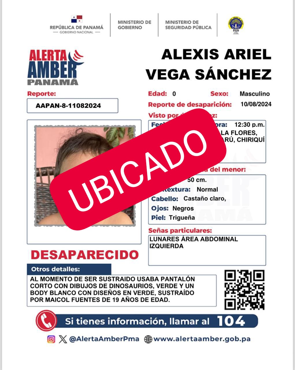La Policía Nacional a través de la Dirección Nacional de Investigación Judicial logra recuperar un infante que había sido reportado como desaparecido por medio de Alerta Amber en el distrito de Barú, el sábado 10 de agosto del presente año. La recuperación del menor se realizó en una residencia ubicada en el sector de Cuesta de Piedra en el distrito de Tierras Altas, donde al momento de la intervención policial, un adulto se da a la fuga dejando al menor en la casa, siendo trasladado por las unidades de investigación para atención médica. La Policía Nacional agradece la rápida colaboración ciudadana. En tanto se mantienen acciones operativas a fin de ubicar al adulto presuntamente vinculado en la sustracción del infante. |
