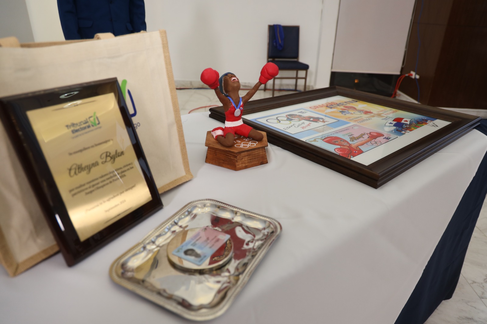 La Sargento Primero y medallista olímpica en la disciplina de Boxeo, Atheyna Bylon, es homenajeada durante un evento organizado por el Tribunal Electoral, en el marco de la Semana de la Democracia.