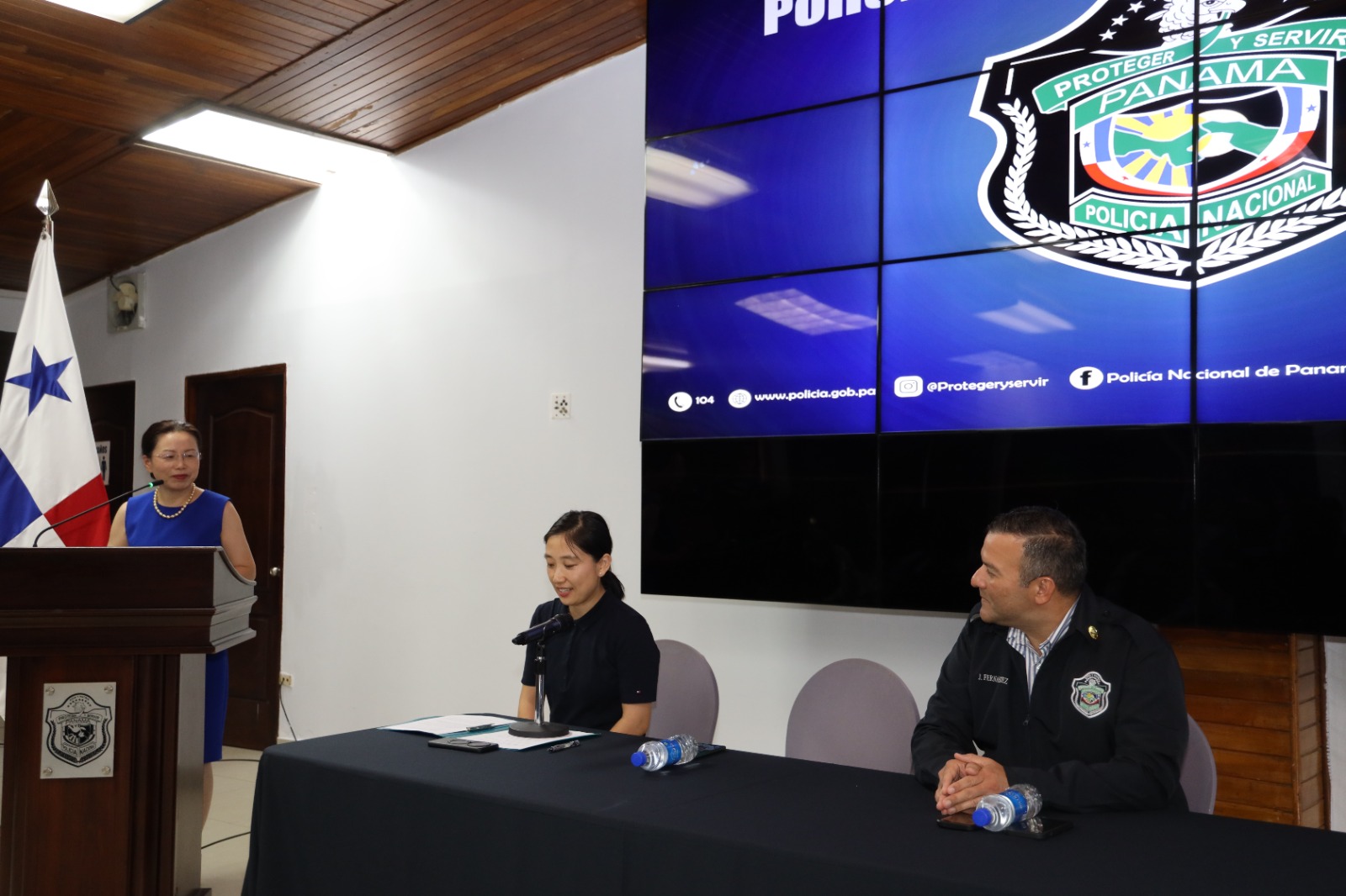 La Policía Nacional recibe la donación de 90 cascos para las unidades del Servicio Policial Motorizado Lince, los cuales serán de gran beneficio para los uniformados durante el desempeño de sus funciones, optimizando la seguridad pública a través de patrullajes en los sectores bancarios, residenciales y comerciales. El Director General de la Policía Nacional, Jaime Fernández, agradeció está importante donación en beneficio de los miembros de la institución. La Embajadora de la República Popular China, Xu Xueyuan, en compañía de Li Liu agregada policial de esta embajada participaron en esta ceremonia, dedicada a honrar la ardua labor de la Institución de Seguridad Pública. |