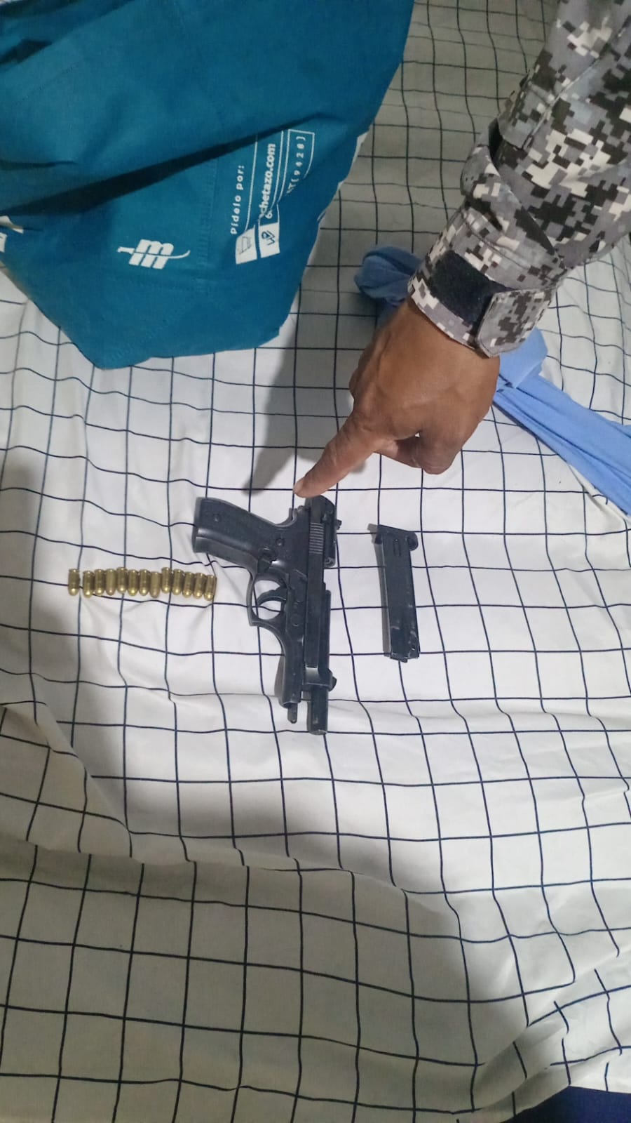 Unidades de la Policía Nacional incautaron un arma de fuego, luego de recibir una denuncia del propietario de varios cuartos de alquiler quien adujo haber sido encañonado por un sujeto (inquilino) quien luego se dio a la fuga. La acción policial se realizó en el sector de Cabuyita de Pacora luego de que el propietario permitiese el ingreso de las unidades quienes, al revisar el cuarto, ubicaron un arma de fuego tipo pistola cerca de un colchón inflable. Se verificó que era un arma de fuego tipo pistola, sin marca ni serie visible, calibre 9mm, de color negro con su proveedor y 13 municiones sin detonar, además de una caja con 26 municiones sin detonar y una cédula de identidad personal con el nombre del presunto involucrado. El caso fue remitido ante las autoridades judiciales correspondientes para deslindar las responsabilidades de rigor. |