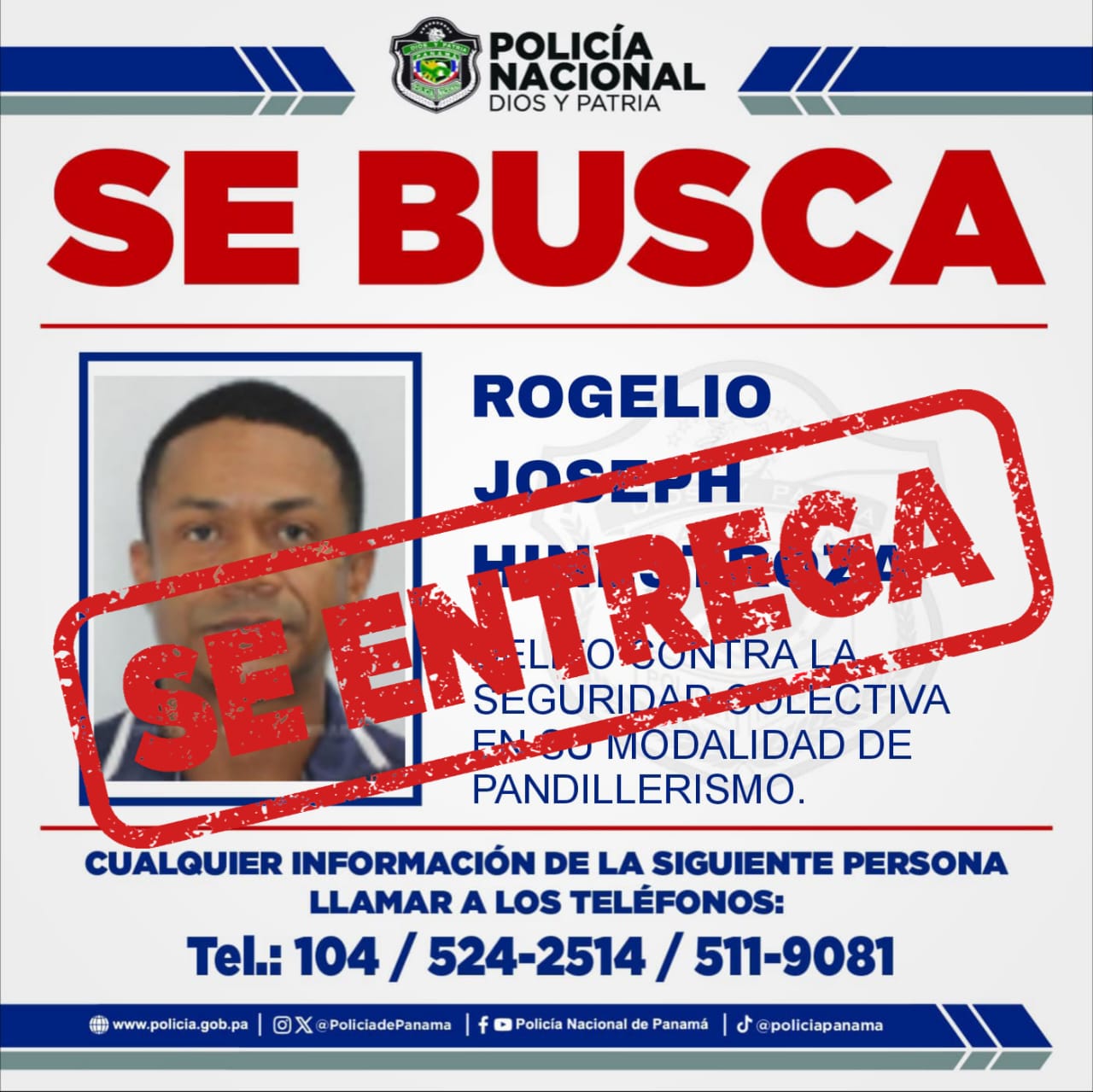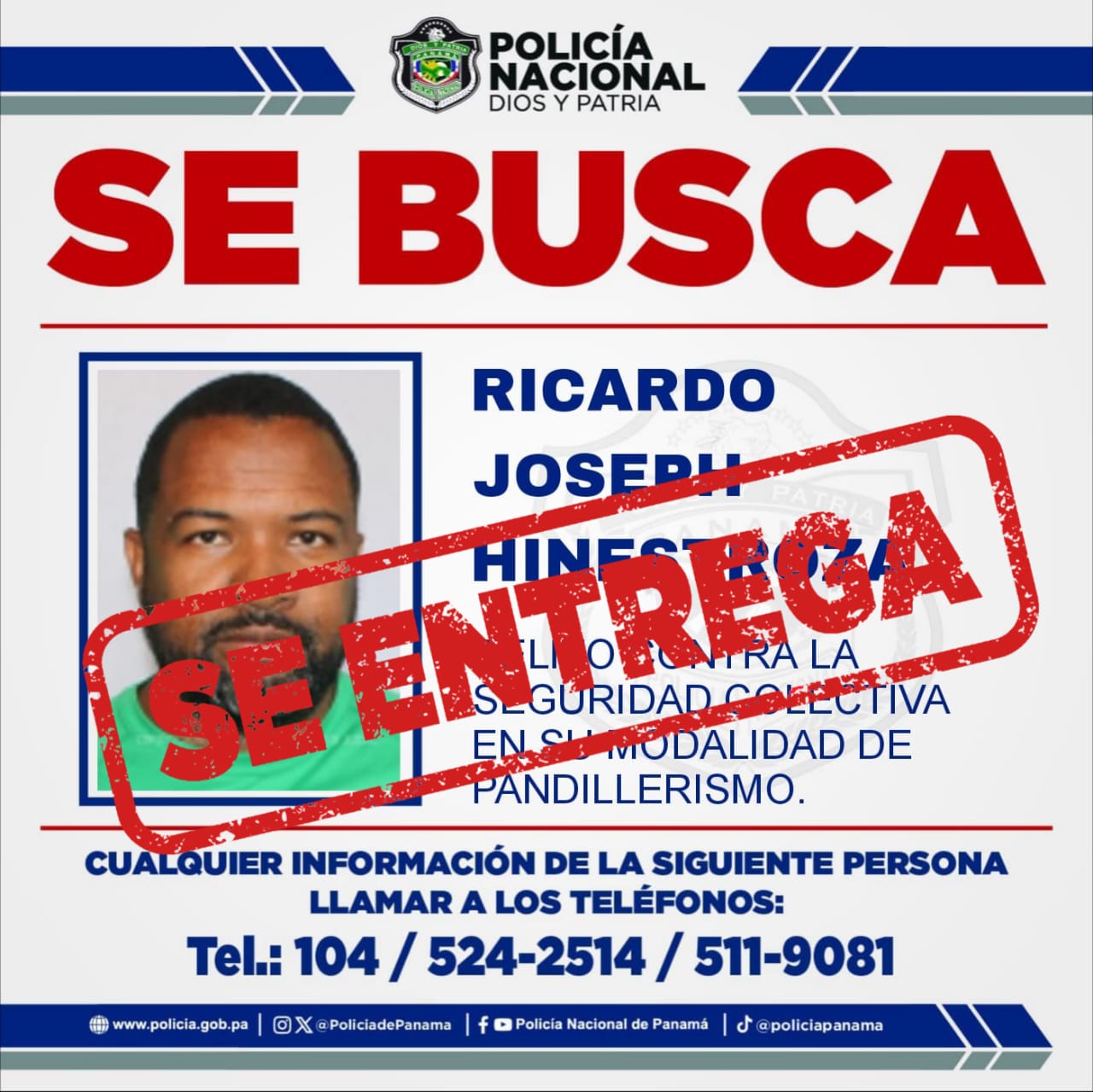 La Policía Nacional en coordinación con el Ministerio Público, hicieron efectiva la aprehensión de tres de los más buscados por delitos contra la seguridad colectiva en su modalidad de pandillerismo. Se trata de Rogelio Hinestroza, Alonso Johnson y Ricardo Joseph, vinculados en investigaciones a la pandilla autodenominada "100% Puros", que operaba en el corregimiento de Pueblo Nuevo. Los requeridos se presentaron ante la Fiscalía de Crimen Organizado en compañía de sus abogados, donde fueron notificados de la orden de aprehensión, siendo remitidos para los trámites correspondientes. |