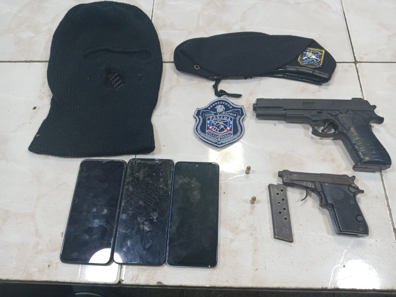 La rápida acción de unidades policiales permitió la aprehensión de cinco personas entre ellos un menor de edad, quienes viajaban a bordo de un vehículo tipo taxi, y al darles la voz de alto los mismos hacen caso omiso y tratan de darse a la fuga sobre la autopista Arraijàn – La Chorrera con dirección a la ciudad Capital. De inmediato se activó el plan de bloqueo y a la altura del puente Perurena, donde fueron aprehendidos los cinco sujetos, al momento de la revisión los uniformados ubicaron dentro del auto una réplica de arma de fuego y revólver calibre 22 con dos municiones sin detonar, un pasamontañas y teléfonos celulares. El subcomisionado Carlos Ortiz, jefe de la Zona Policial de Arraijàn, indico que uno de los aprehendidos mantiene prontuario delictivo por robo a mano armada a un local comercial en el año 2019. Las personas aprehendidas junto a los indicios serán puestos a órdenes de un juez de garantías para los trámites pertinentes. |