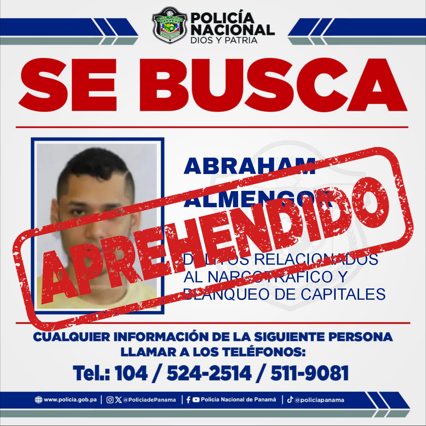 La Policía Nacional da con la aprehensión de Abraham Eloy Almengor de 32 años, quien figura como uno de los más buscados en la Operación Napoleón por delitos de narcotráfico y blanqueo de capitales. Su aprehensión se dio en la provincia de Chiriquí, específicamente en el sector de Alto Verde en el corregimiento de David, siendo trasladado para los trámites correspondientes a órdenes de la Fiscalía de Drogas. La Operación Napoleón se desarrolló el 25 de enero de 2023 en las provincias de Chiriquí, Bocas del Toro y Veraguas, siendo aprehendidas 30 personas. |