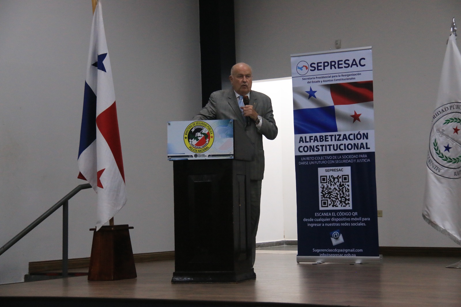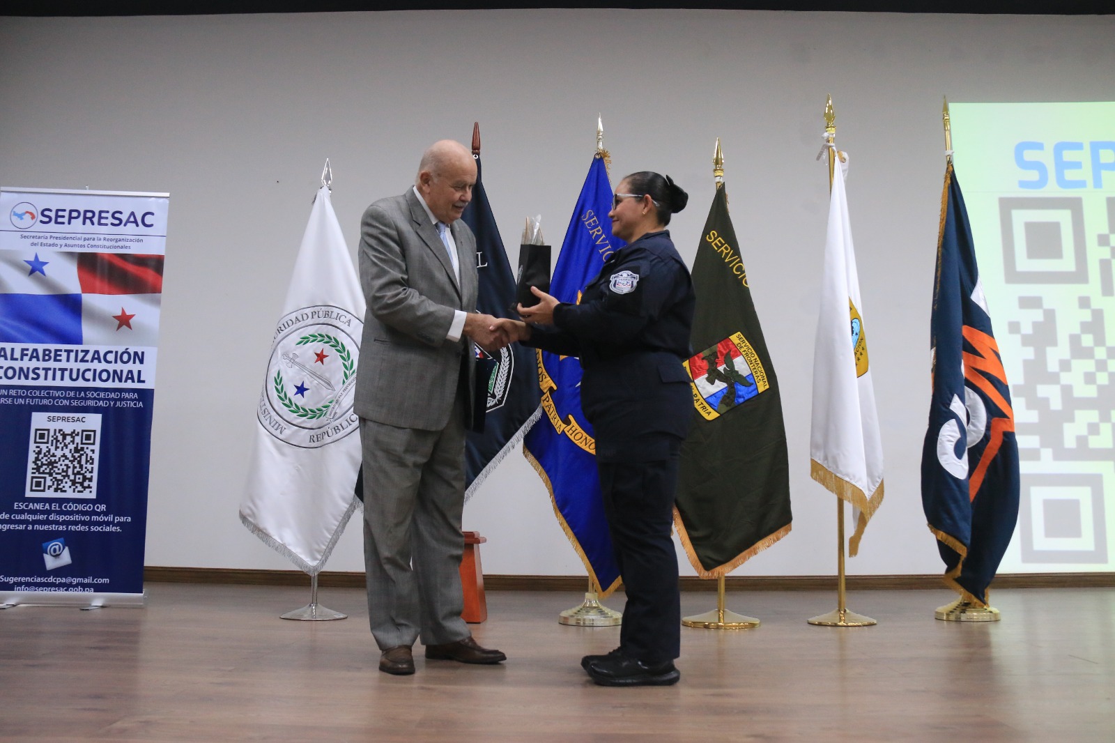 La Secretaría Presidencial para la Reorganización del Estado y Asuntos Constitucionales, en coordinación con el Ministerio de Seguridad Publico, realizó la primera jornada de “Alfabetización constitucional”, dirigida a miembros de los estamentos de seguridad, bajo el lema “Un reto colectivo de la sociedad para darse un futuro con seguridad y justicia”. Esta actividad, desarrollada en el auditorio del Instituto Superior Policial “Presidente Belisario Porras”, fue impartida por el Lic. Miguel Antonio Bernal Villalaz, a más de 400 unidades policiales; señalando que la finalidad de capacitarles es: “Habilitar de manera integral la participación de las unidades, con el fin de ser entes multiplicadores de la información, tanto en su área laboral, así como, con la sociedad en general. Con este tipo de capacitaciones, la Policía Nacional refuerza su compromiso con el respeto a los derechos humanos y la legalidad, pilares esenciales para el buen desempeño de sus funciones y la confianza ciudadana. |