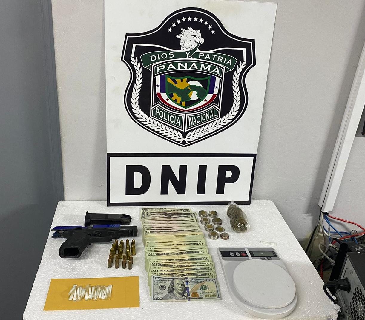 Durante el operativo, se les decomisó un arma de fuego tipo pistola, un proveedor, 20 municiones de diversos calibres, presuntas sustancias ilícitas, una pesa digital y 900 balboas en efectivo, todo ubicado dentro de una residencia.