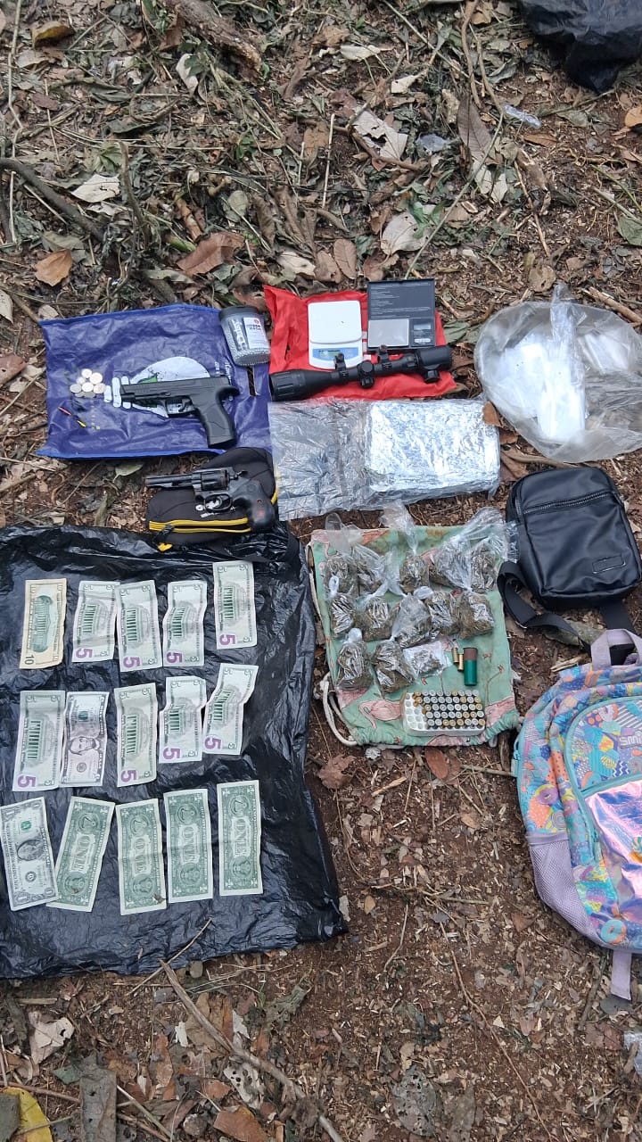 Mediante denuncia ciudadana, unidades policiales fueron alertadas sobre la presencia de ciudadanos en un área boscosa en la barriada La Estancia #1, corregimiento de Herrera; inmediatamente acudimos al lugar donde se logra ubicar un terreno que era utilizado como búnker. Al llegar los uniformados observaron que se mantenían dos ciudadanos que al ser verificados, se logra ubicar un arma de fuego calibre 38, un arma tipo réplica, municiones, una mira telescópica, doce bolsistas, un paquete con presunta sustancia ilícita, pesas digitales, equipos tecnológicos, dinero en efectivo y otros artículos. Los aprehendidos, así como los indicios, serán puestos a órdenes de las autoridades correspondientes. |