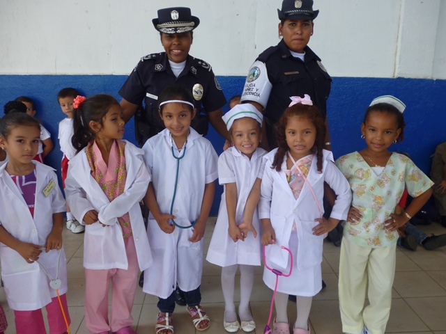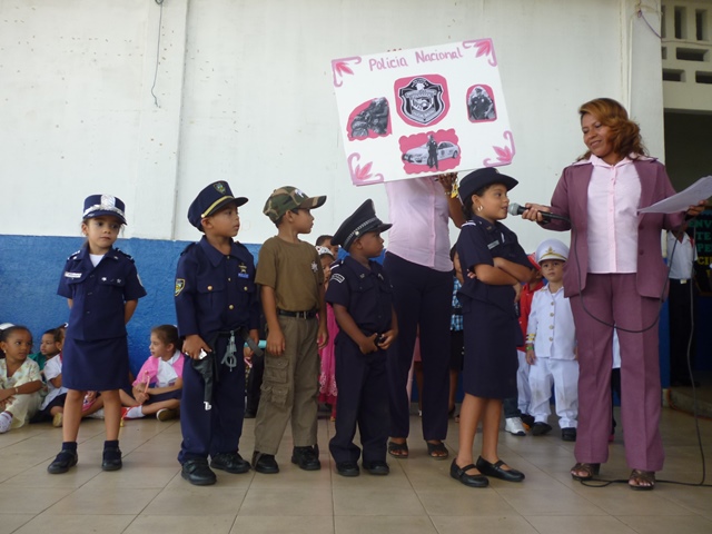 Niños que cursan el kínder de la Escuela José Gabriel Duque en el corregimiento de Chepo, celebraron el día del trabajo luciendo el uniforme de la Policía Nacional y acompañados de las unidades de la zona. Los docentes de la escuela realizaron un concurso de vestuario entre ellos, bomberos, enfermeros y hasta abogados. La presencia de la policía fue de mucha alegría en el centro educativo, donde también se hizo entrega de reconocimientos por parte de la policía a los maestros. |