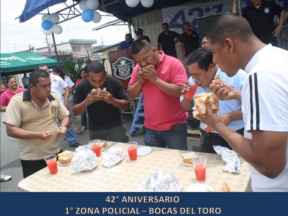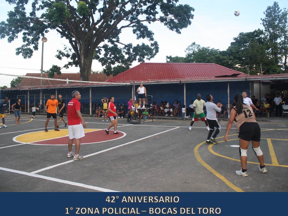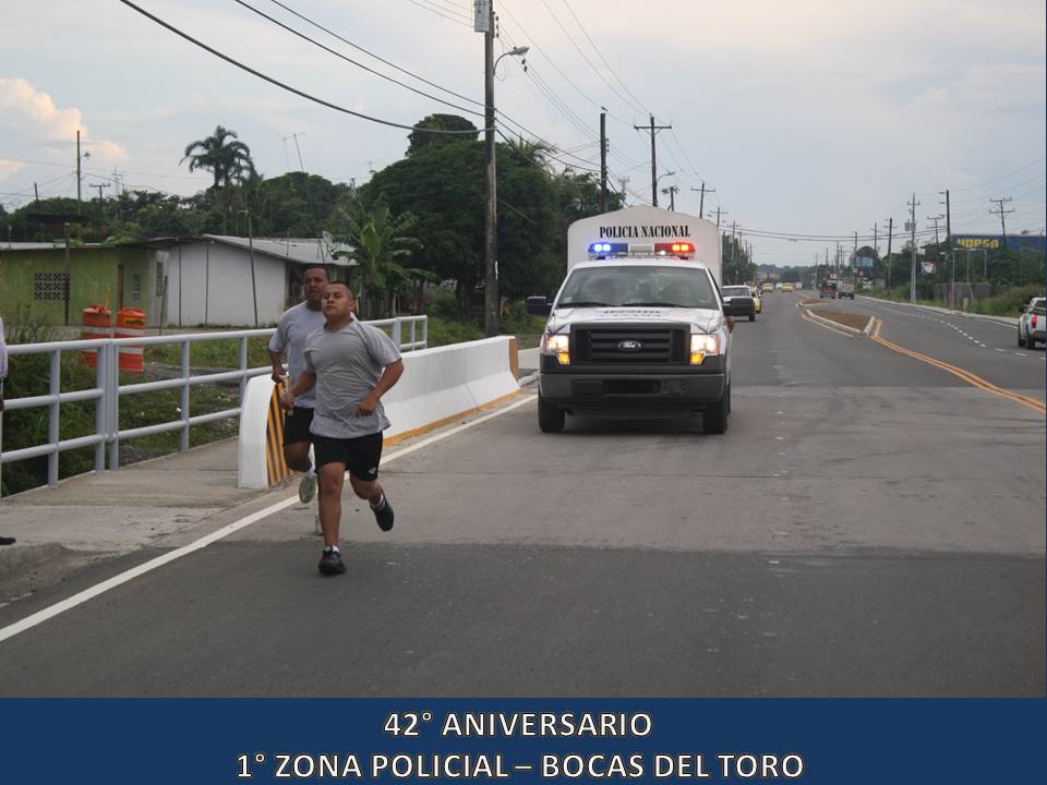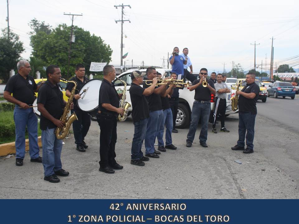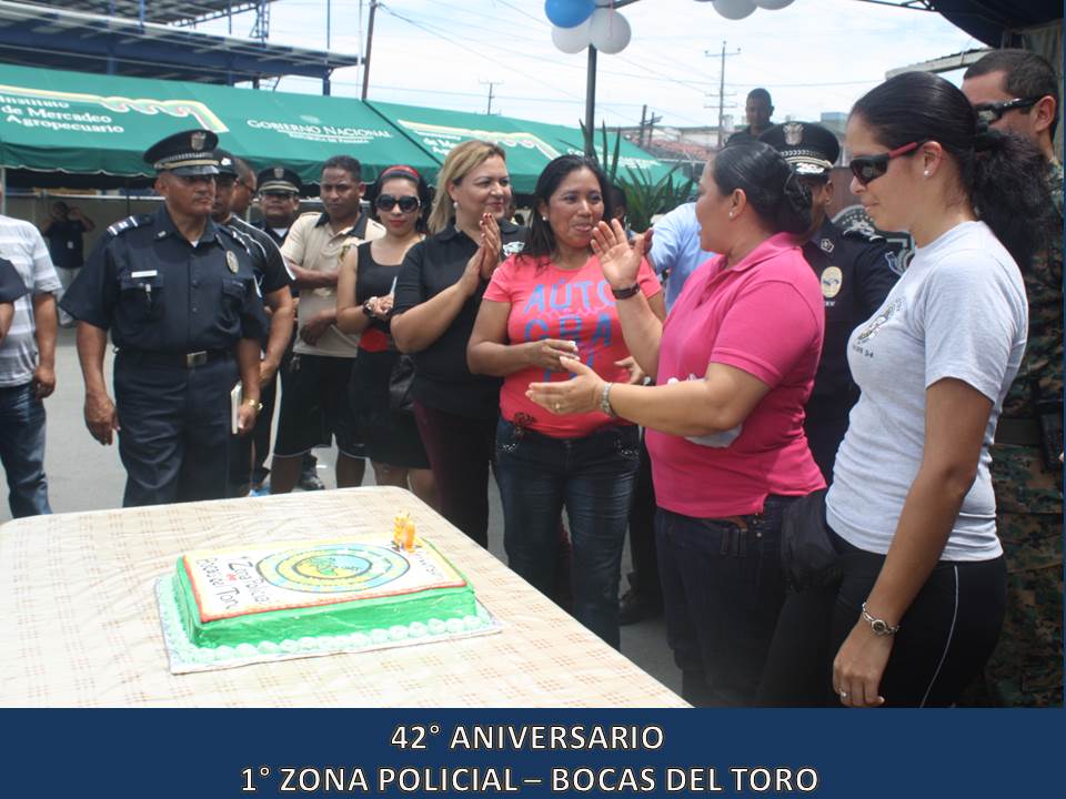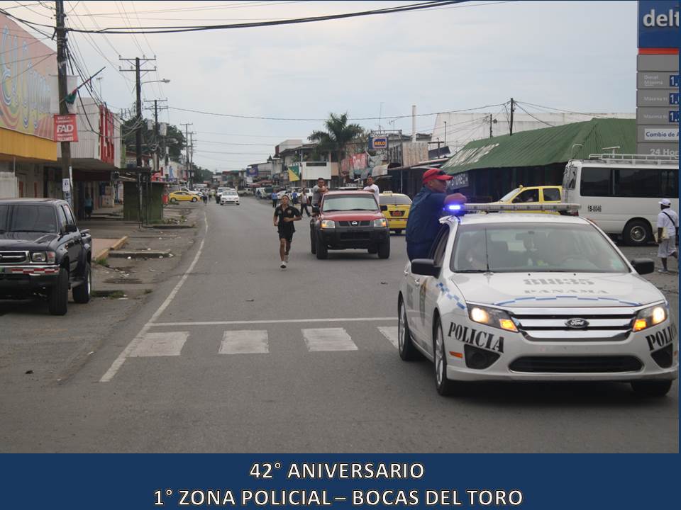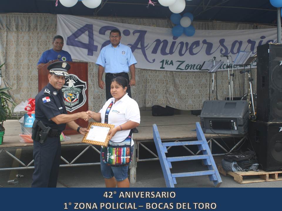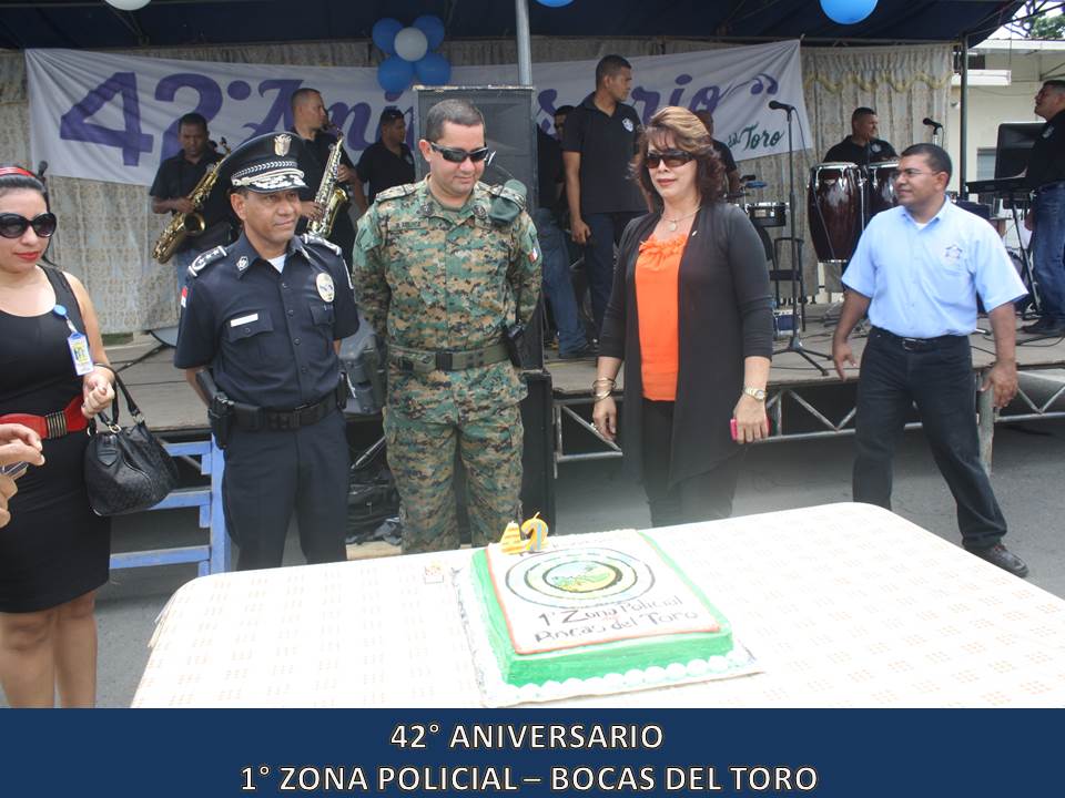 Unidades de la 1° Zona Policial de Bocas del Toro, celebraron este miércoles 5 de junio del 2013, el 42° Aniversario de su Zona Policial la que fue organizada en el año 1971 donde se forma un Grupo de Reacción a los que llamó “Los Bucaneros”. La celebración dio inicio con dianas a las 05:30 de la madrugada, luego se realizó una maratón de unos 4 kilómetros, se entregaron canastillas y artículos para bebé al Centro Nutre Hogar en Changuinola para después iniciar los actos protocolares donde se entregaron certificados de agradecimiento a ciudadanos amigos la Policía Nacional desde hace muchos años como también a Vecinos Vigilantes destacados en su participación de estos programas. Para finalizar la celebración, dio inicio simultáneamente tres torneos de Futbol sala, tenis de mesa y de Voleibol donde participaron unidades de la Policía Nacional, funcionarios de diferentes instituciones Gubernamentales y ciudadanos de la comunidad. El Comisionado Javier Castillo, Jefe actual de la 1° Zona Policial en su discurso manifestó estar complacido en ser jefe de esta Zona por el profesionalismo de sus unidades como también el alto grado de civismo y buena voluntad que tienen sus pobladores.