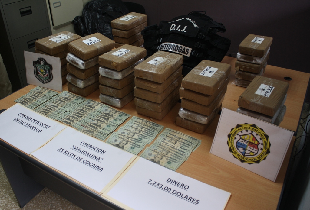 Tras una diligencia de vigilancia y seguimiento unidades de Narcótico de la Dirección de Investigación Judicial (DIJ) decomisan 45 paquetes dentro de dos apartamentos ubicados en Bella Vista. Los paquetes de la droga estaban forrados con cinta adhesiva color chocolate y mantenían el logo ‘Rolex’ La operación denominada ‘Magdalena’ se realizó en horas de la noche en dos apartamentos de la localidad, en conjunto con la Fiscalía Especializada en Delitos Relacionados con Drogas, donde también se dio con la detención de dos sujetos de nacionalidad panameña, quienes se mantenían en el lugar durante el allanamiento. Además se incautó un vehículo Porsche Cayenne del año propiedad de uno de los detenidos y la suma de siete mil doscientos treinta tres dólares en efectivo (B/.7,233.00), entre ambas habitaciones. Las instancias correspondientes determinarán la procedencia de este dinero. La evidencia y los detenidos fueron puestos a órdenes de las autoridades judiciales quienes continuarán con las investigaciones del caso. |