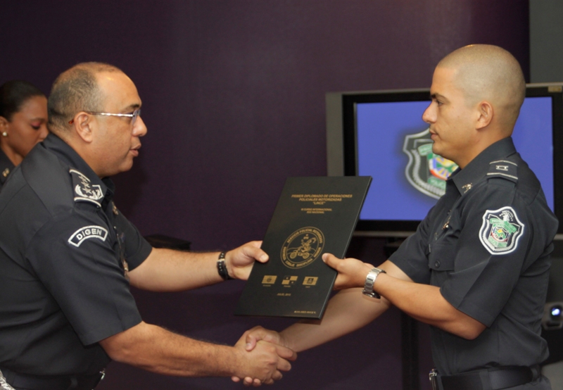 Un grupo de 38 unidades conformadas por miembros del Servicio de Protección Institucional (SPI); la Policía Nacional de Panamá, la Policía Nacional de Haití y la Policía Nacional de Ecuador, participaron del Primer Diplomado Internacional de Operaciones Policiales Especiales Motorizadas, Linces. En el acto de graduación de las unidades estuvieron presentes el Embajador de Haití en Panamá, su excelencia Philippe Archer; el Coronel Edgar Proaño Agregado Policial de la Embajada del Ecuador en Panamá y el Comisionado David Ramos, Secretario General de la Policía Nacional.¡ En el curso participaron 5 unidades de la Policía Nacional de Haití; un representante de la Policía Nacional de Ecuador; 5 unidades del Servicio de Protección Institucional y 27 unidades de la Policía Nacional de Panamá. Los participantes pudieron conocer los procedimientos policiales según los principios de legalidad y casuísticas; formas adecuadas del mantenimiento de las motos; el uso y manejo adecuado de armas de fuego; la forma adecuada de utilizar los procedimientos policiales tomando en cuenta las garantías fundamentales y los derechos humanos. Igualmente se capacitaron en destrezas y habilidades en el manejo y conducción de la motocicleta; las técnicas del binomio conformado por la unidad de apoyo táctico y el conductor de la moto; el uso adecuado de los equipos policiales y el patrullaje motorizado con eficiencia y eficacia. La implementación de medidas de seguridad, primeros auxilios, apoyo táctico, maniobra y destrezas, así como procedimientos especiales motorizados fueron elementos esenciales que se enseñaron durante este curso para el beneficio y seguridad de las comunidades que habitan en los países participantes de este diplomado. |