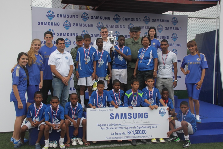 Altos representantes de la Policía Nacional de Panamá, estuvieron presentes en la final de la Copa de Futbol Infantil Samsung, que se llevó a cabo este sábado 31 de agosto en el estadio Ernesto “Cascarita” Tapia, ubicado en el Complejo Deportivo Rommel Fernández. Correspondió a los Comisionados Miguel García, Néstor Valdés y Roberto Castillo hacer entrega de los trofeos y medallas a los integrantes de los equipos ganadores de este torneo en el cual participaron inicialmente 48 equipos integrados por niños en edades comprendidas entre 8 a 12 años. Un total de 24 equipos infantiles que participaron en este evento, pertenecen a la ciudad capital, otros 12 a la provincia de Colón e igual cantidad (12) a la provincia de Chiriquí. En la final, la Escuela Medalla Milagrosa de Chiriquí se enfrentó por el tercer lugar a la escuela Manuel Amador Guerrero, la cual se impuso un gol por cero sobre los atletas de la altiva provincia, en tanto la escuela Desmond Byam de la provincia de Colón, sucumbió ante los goles de la escuela Justo Arosemena de Panamá. La Copa Samsung 2013 es parte de las iniciativas de responsabilidad social empresarial y el Movimiento Nueva Generación, cuya labor es apoyada decididamente por la Policía Nacional de Panamá, quienes buscan en conjunto promover los valores del deporte desde tempranas edades a fin de contribuir no solo a la inclusión social sino también al desarrollo físico, la salud mental y la motivación hacia la superación intelectual de los niños a través del deporte. |