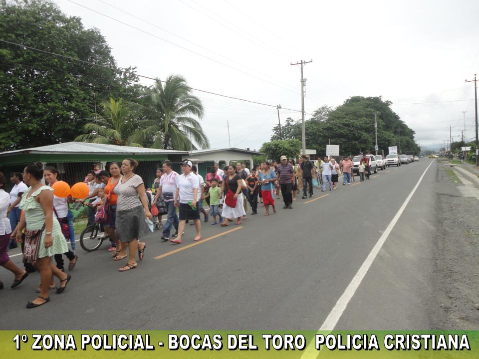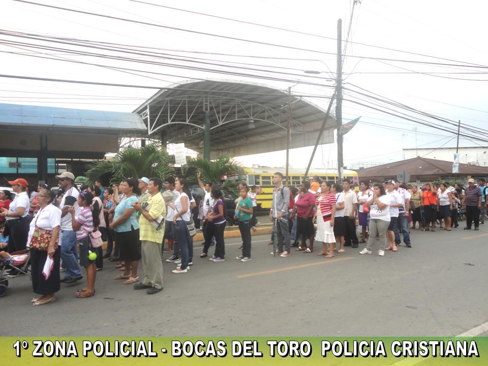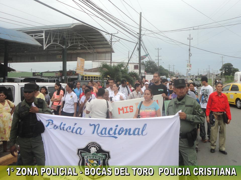 El pasado domingo 1 de septiembre de 2013, en horas de la tarde, unidades del Servicio de Policía Cristiana de la 1ª Zona Policial de Bocas del Toro junto a diferentes congregaciones de Iglesias Evangélicas de la provincia, realizaron una marcha en conmemoración del mes de las Sagradas Escrituras. En el evento participaron más de cien personas quienes recorrieron las principales calles del Distrito orando por la paz en la región y dando gracias al creador por la Biblia. La Policía Nacional y la Alianza evangélica de en Bocas del Toro ha organizado para este mes diversas actividades entre las cuales figura la lectura total de la Biblia las 24 horas del día hasta leerla en su totalidad. |